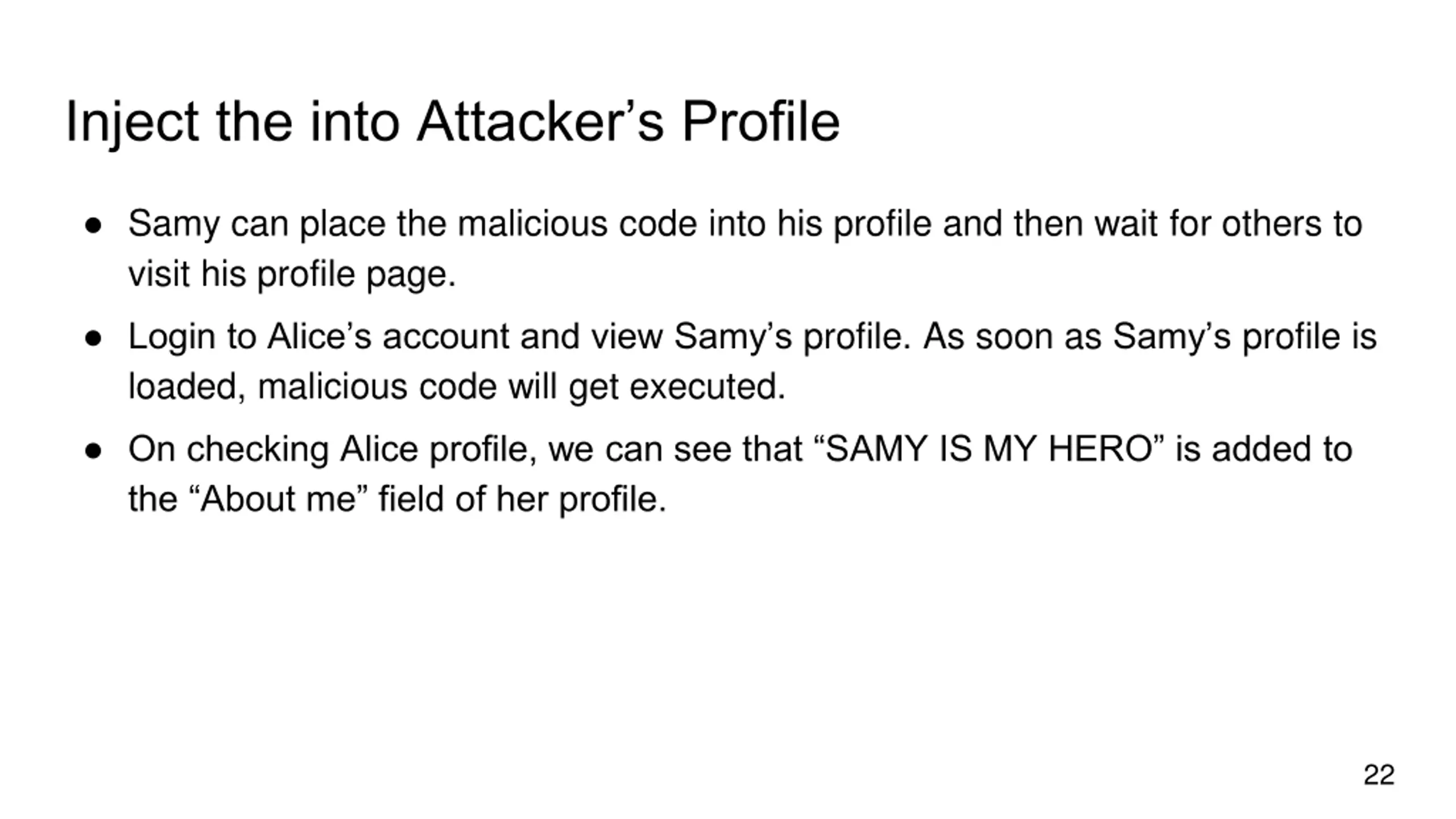 Inject the into Attackers Profile Samy can place the malicious code into his profile and then wait for others to visit his profile page. Login to Alice s account and view Samy s profile. As soon as Samy s profile is loaded, malicious code will get executed. On checking Alice profile, we can see that SAMY IS MY HERO is added to the About me field of her profile. 22