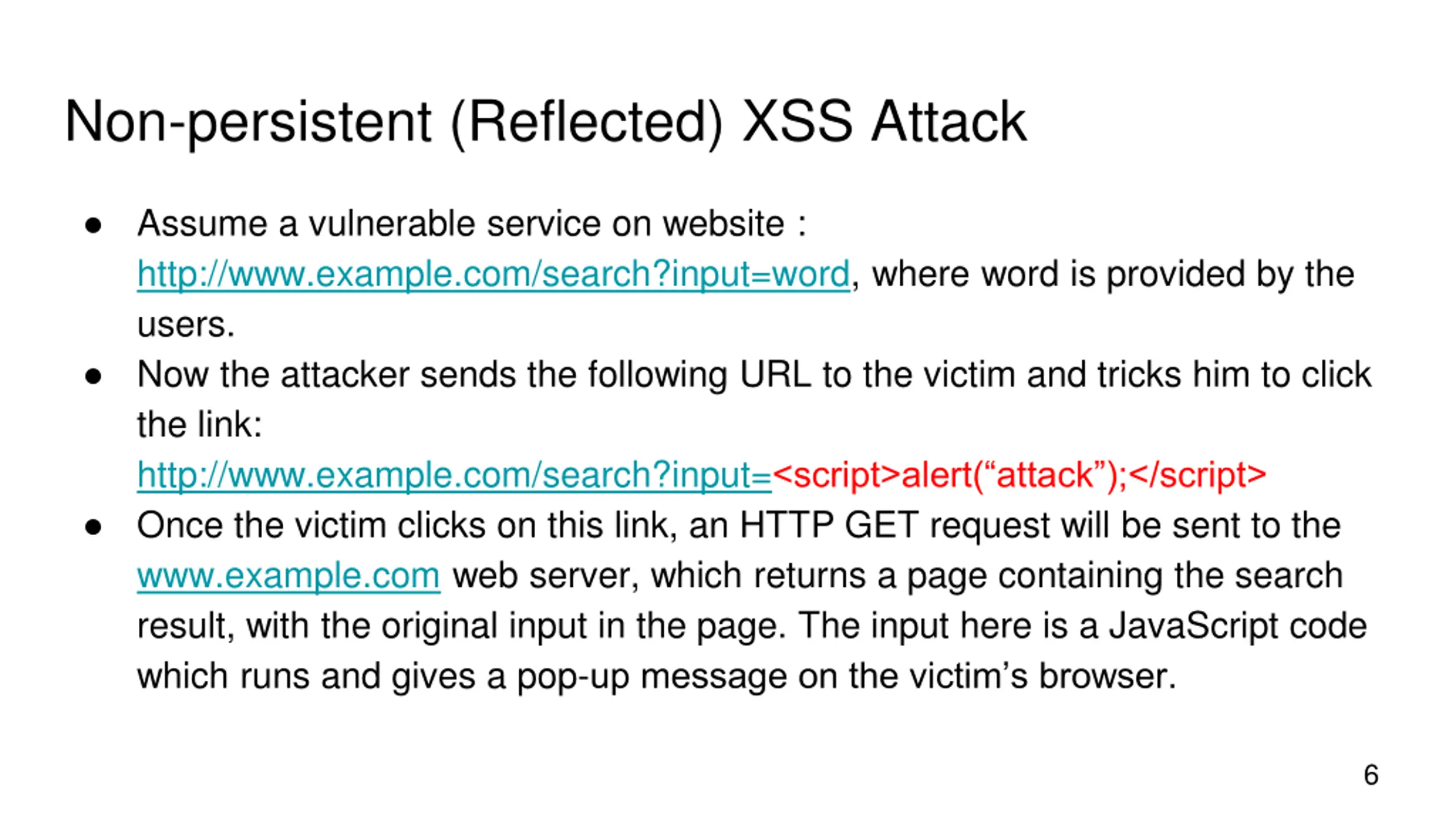 Non-persistent (Reflected) XSS Attack Assume a vulnerable service on website : http://www.example.com/search?input=word, where word is provided by the users. Now the attacker sends the following URL to the victim and tricks him to click the link: http://www.example.com/search?input=<script>alert( attack );</script> Once the victim clicks on this link, an HTTP GET request will be sent to the www.example.com web server, which returns a page containing the search result, with the original input in the page. The input here is a JavaScript code which runs and gives a pop-up message on the victim s browser. 6