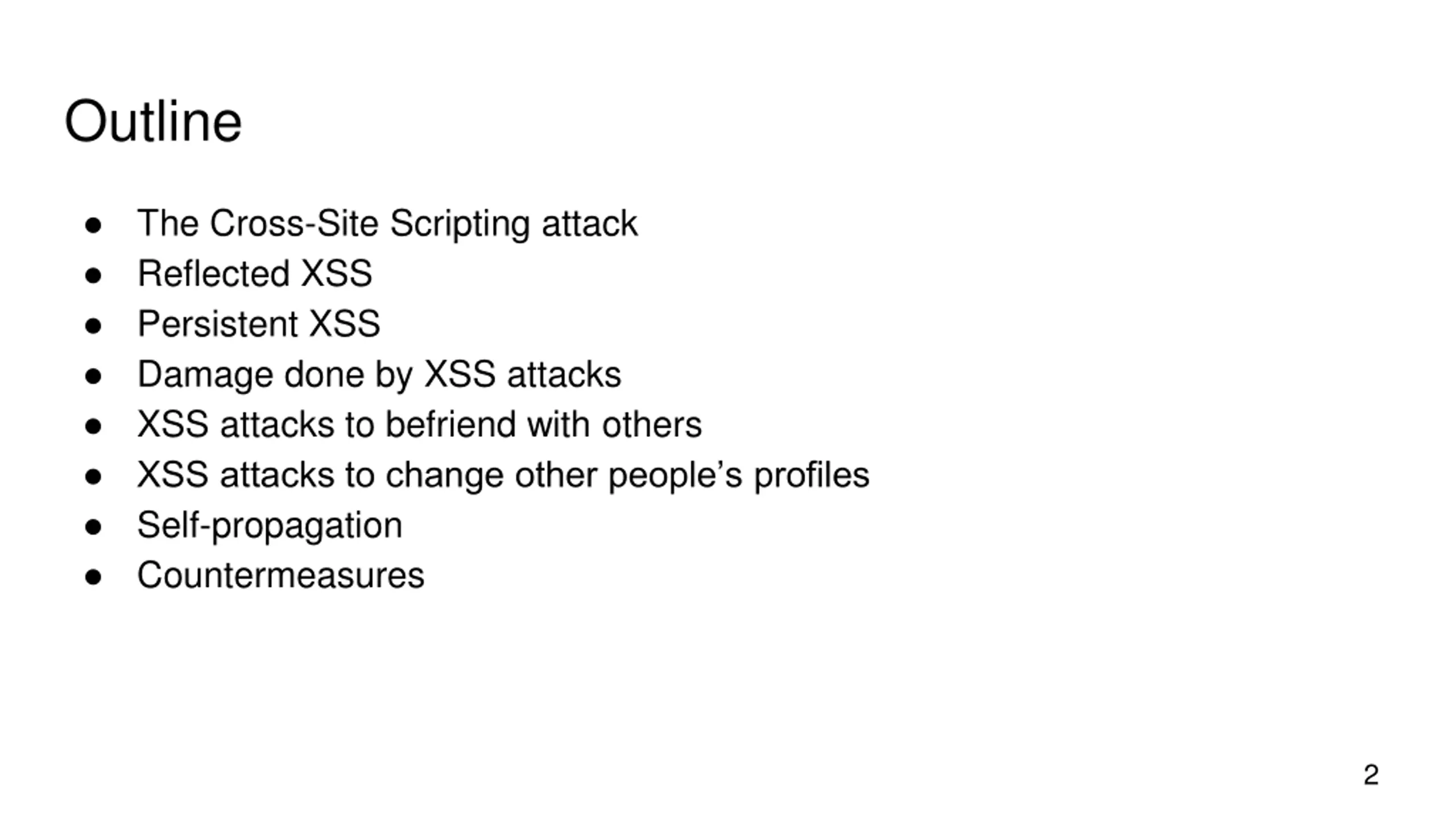 Outline The Cross-Site Scripting attack Reflected XSS Persistent XSS Damage done by XSS attacks XSS attacks to befriend with others XSS attacks to change other people s profiles Self-propagation Countermeasures 2