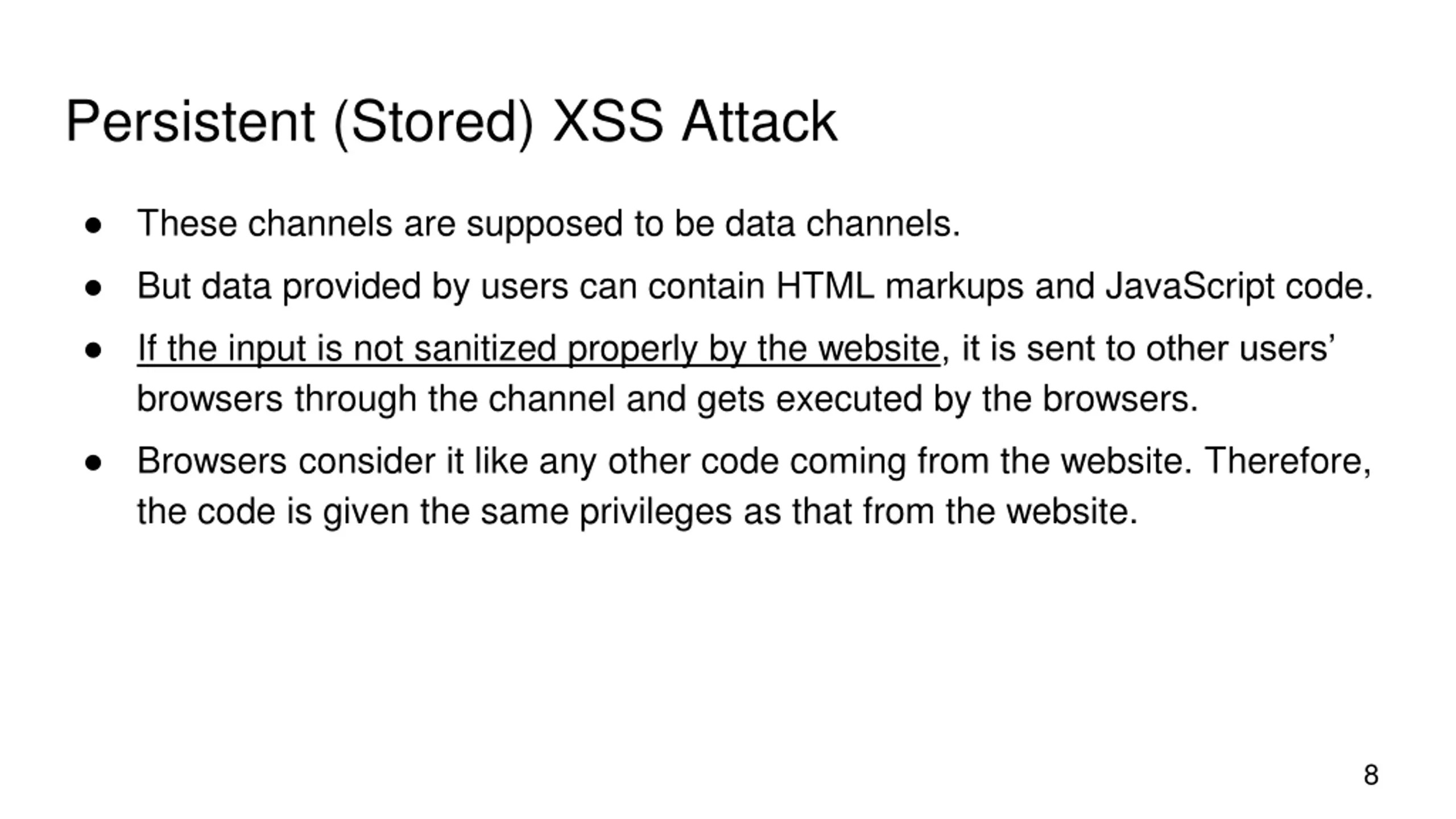 Persistent (Stored) XSS Attack These channels are supposed to be data channels. But data provided by users can contain HTML markups and JavaScript code. If the input is not sanitized properly by the website, it is sent to other users browsers through the channel and gets executed by the browsers. Browsers consider it like any other code coming from the website. Therefore, the code is given the same privileges as that from the website. 8