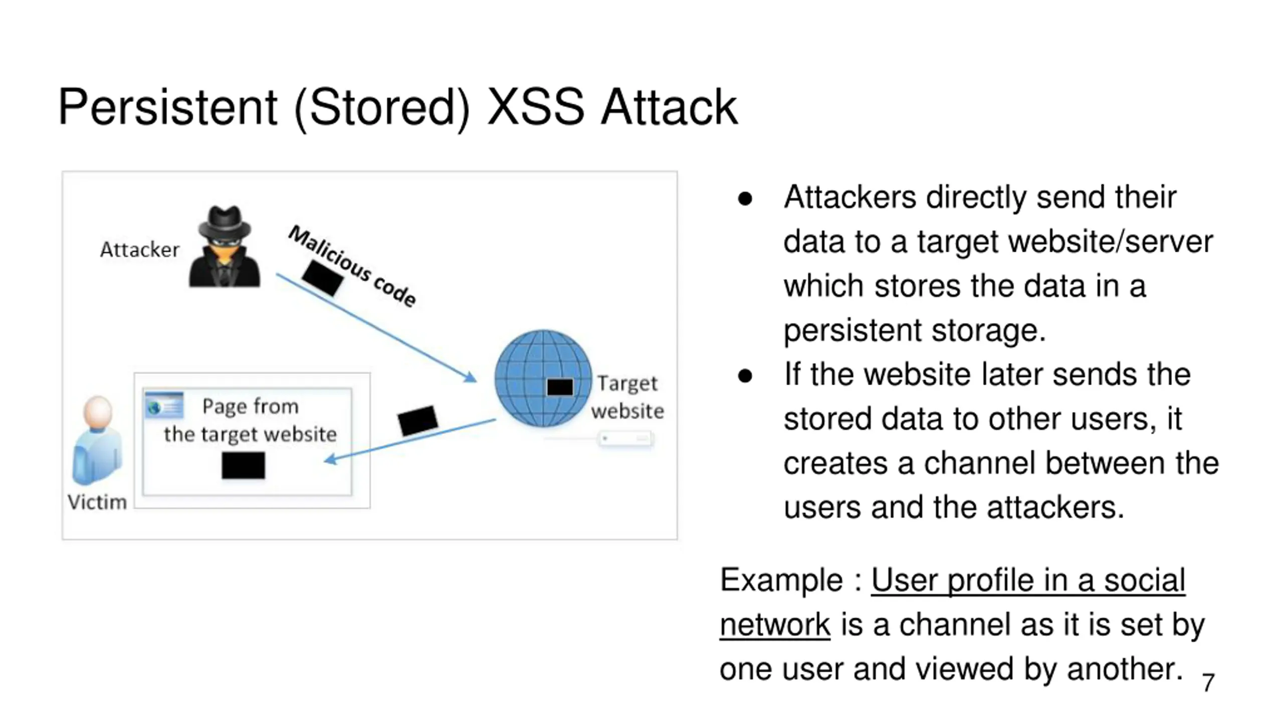 Persistent (Stored) XSS Attack Attackers directly send their data to a target website/server which stores the data in a persistent storage. If the website later sends the stored data to other users, it creates a channel between the users and the attackers. Example : User profile in a social network is a channel as it is set by one user and viewed by another.7
