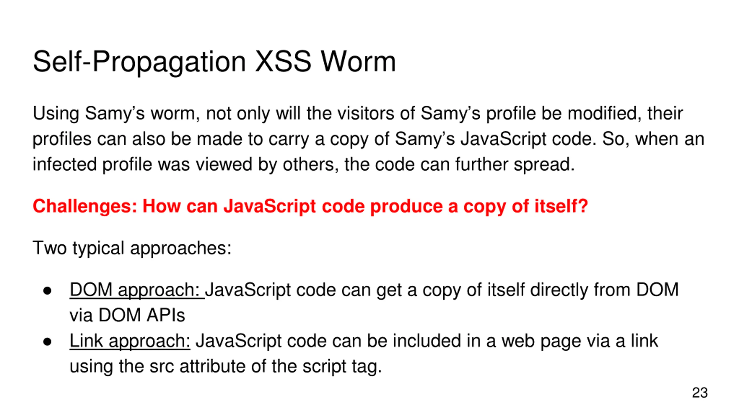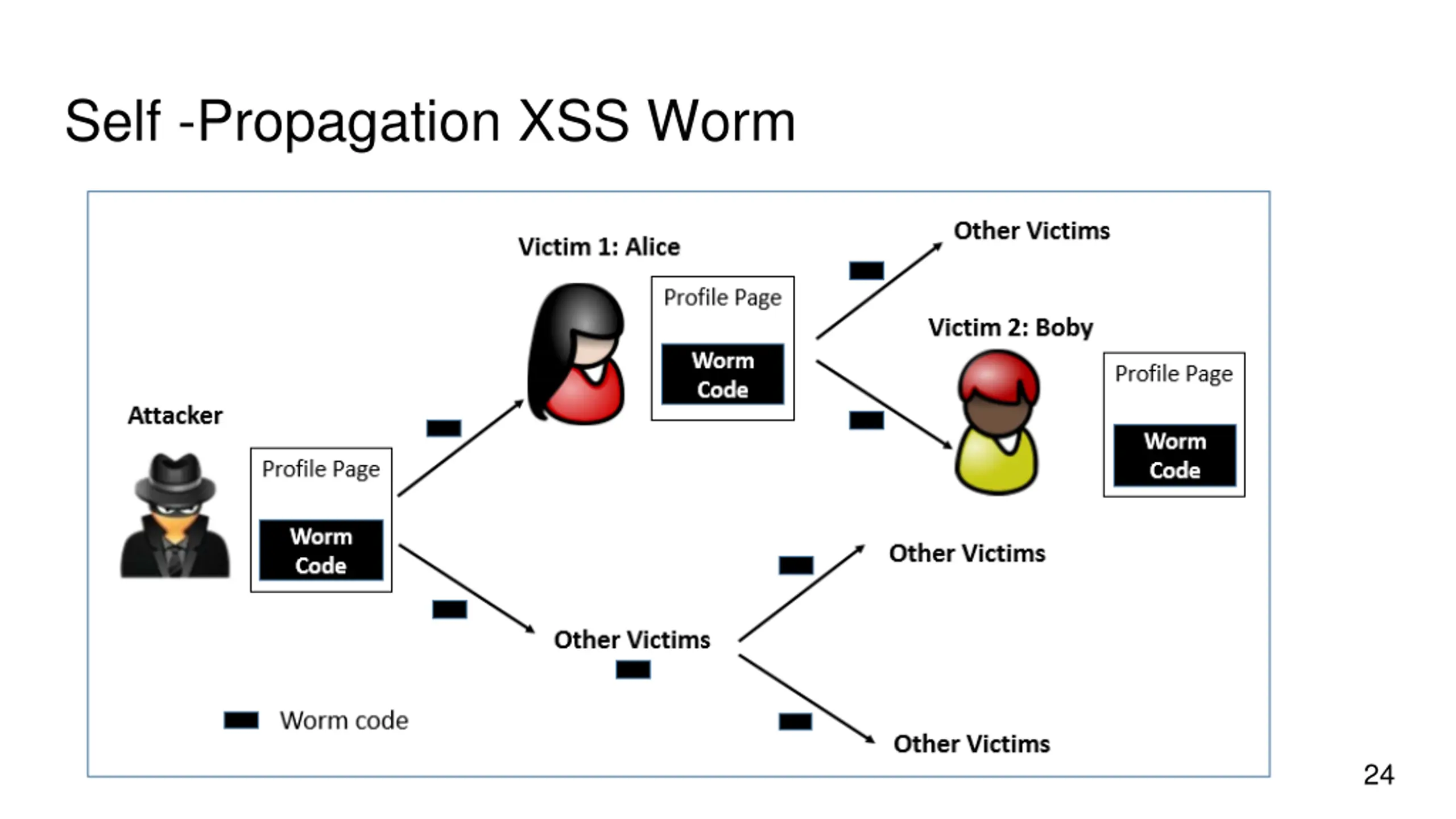 Self-Propagation XSS Worm Using Samy s worm, not only will the visitors of Samy s profile be modified, their profiles can also be made to carry a copy of Samy s JavaScript code. So, when an infected profile was viewed by others, the code can further spread. Challenges: How can JavaScript code produce a copy of itself? Two typical approaches: DOM approach: JavaScript code can get a copy of itself directly from DOM via DOM APIs Link approach: JavaScript code can be included in a web page via a link using the src attribute of the script tag. 23