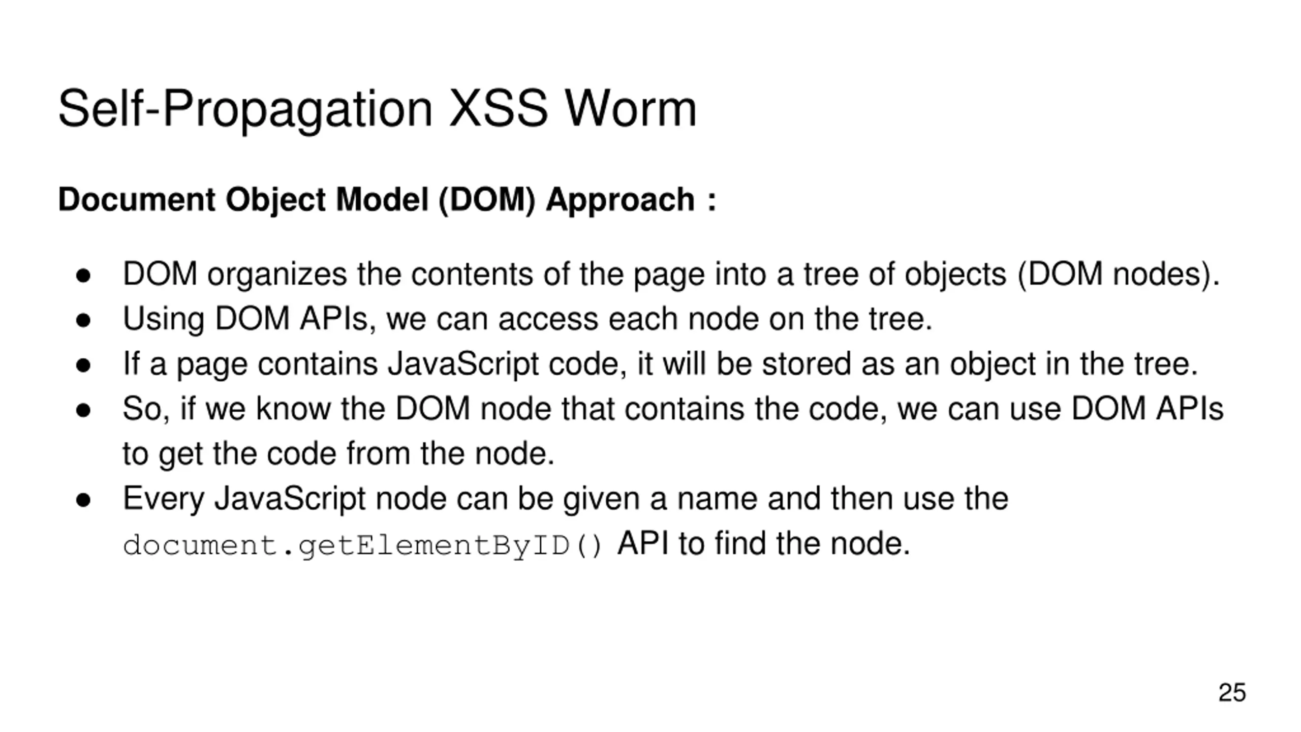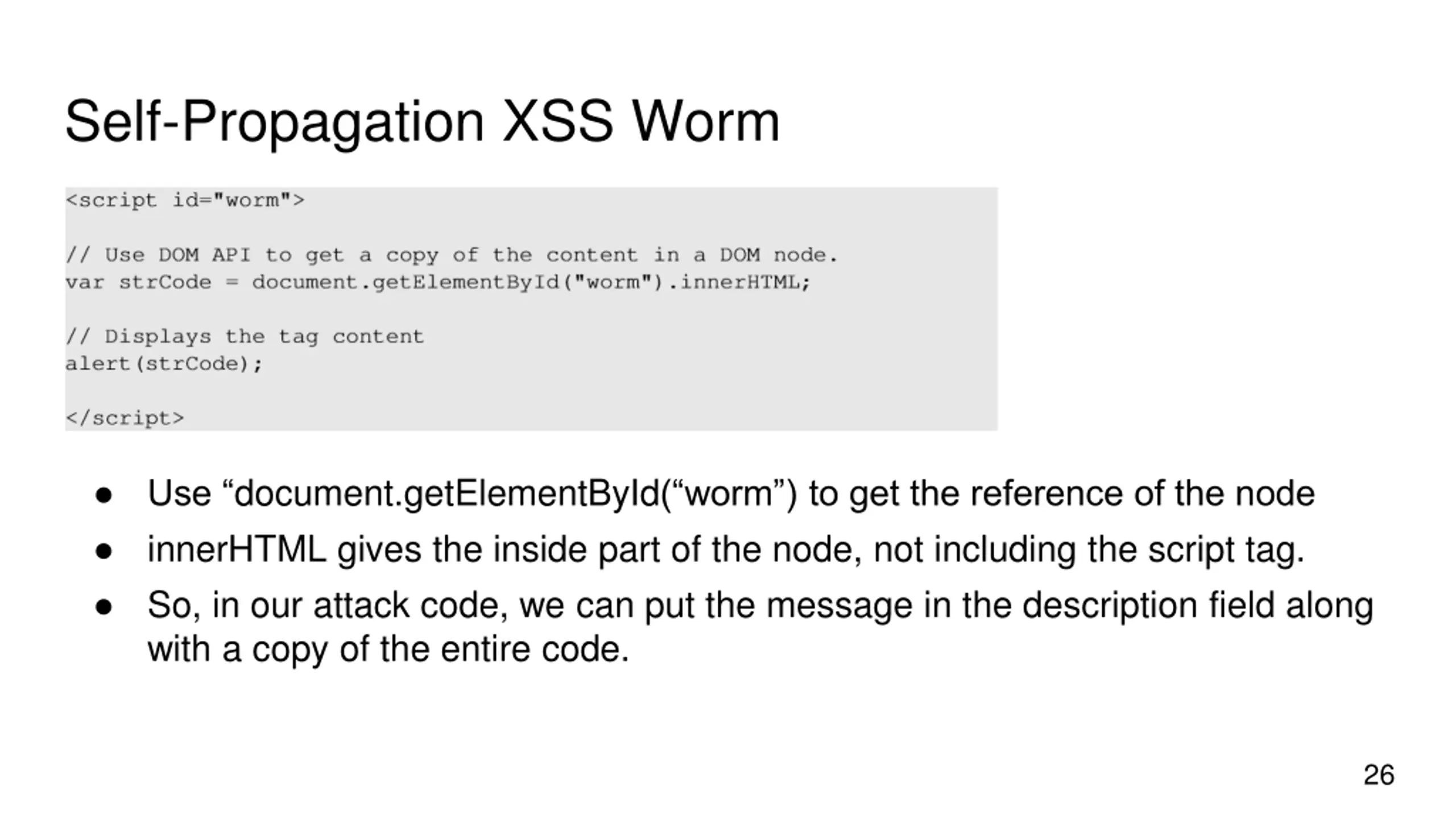 Self-Propagation XSS Worm Document Object Model (DOM) Approach : DOM organizes the contents of the page into a tree of objects (DOM nodes). Using DOM APIs, we can access each node on the tree. If a page contains JavaScript code, it will be stored as an object in the tree. So, if we know the DOM node that contains the code, we can use DOM APIs to get the code from the node. Every JavaScript node can be given a name and then use the document.getElementByID() API to find the node. 25