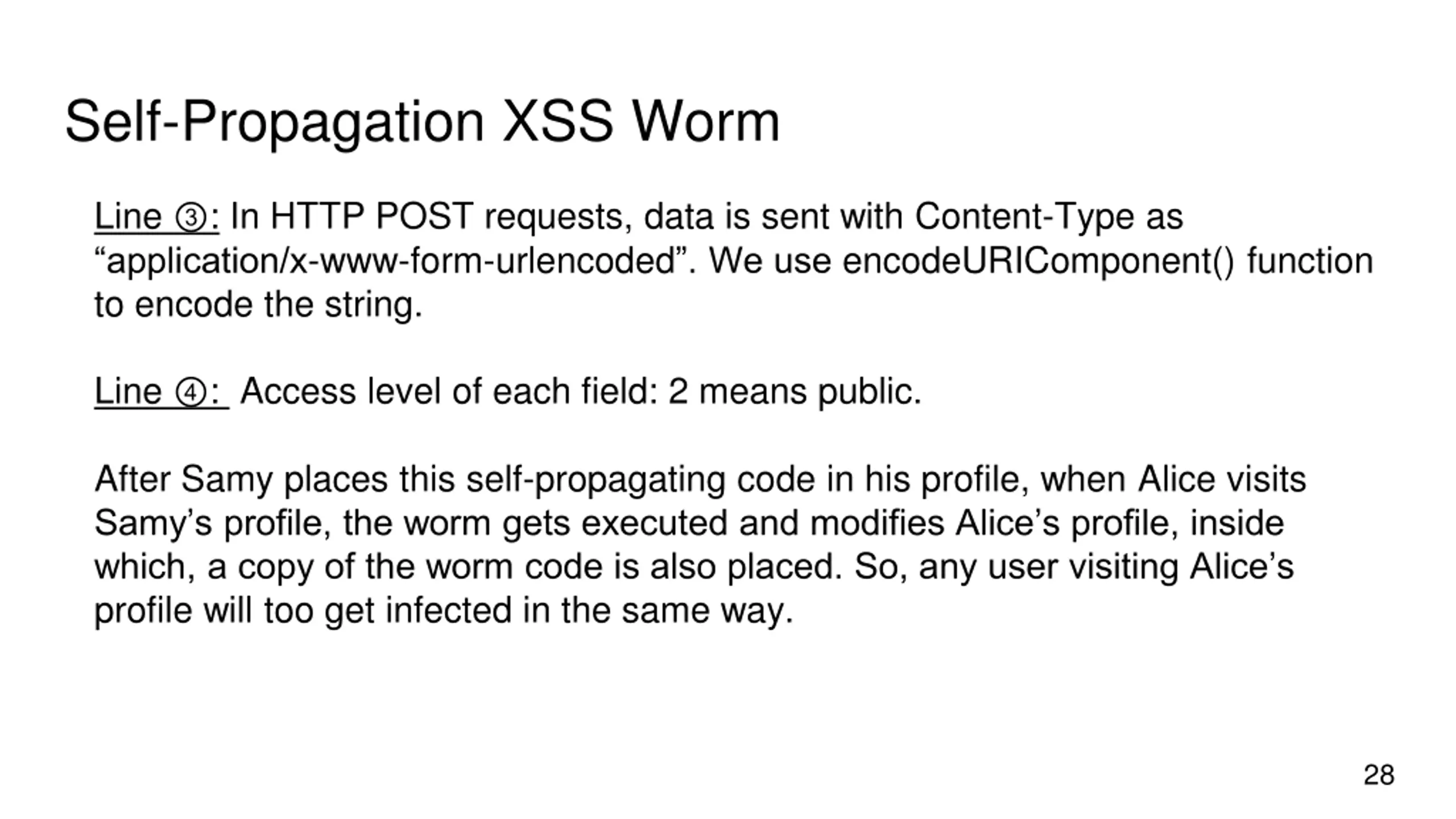 Self-Propagation XSS Worm Line : In HTTP POST requests, data is sent with Content-Type as application/x-www-form-urlencoded . We use encodeURIComponent() function to encode the string. Line : Access level of each field: 2 means public. After Samy places this self-propagating code in his profile, when Alice visits Samy s profile, the worm gets executed and modifies Alice s profile, inside which, a copy of the worm code is also placed. So, any user visiting Alice s profile will too get infected in the same way. 28