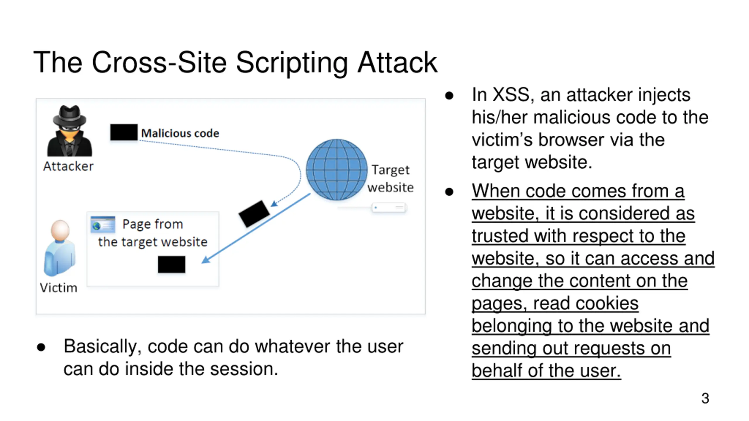 The Cross-Site Scripting Attack In XSS, an attacker injects his/her malicious code to the victim s browser via the target website. When code comes from a website, it is considered as trusted with respect to the website, so it can access and change the content on the pages, read cookies belonging to the website and sending out requests on behalf of the user. Basically, code can do whatever the user can do inside the session. 3