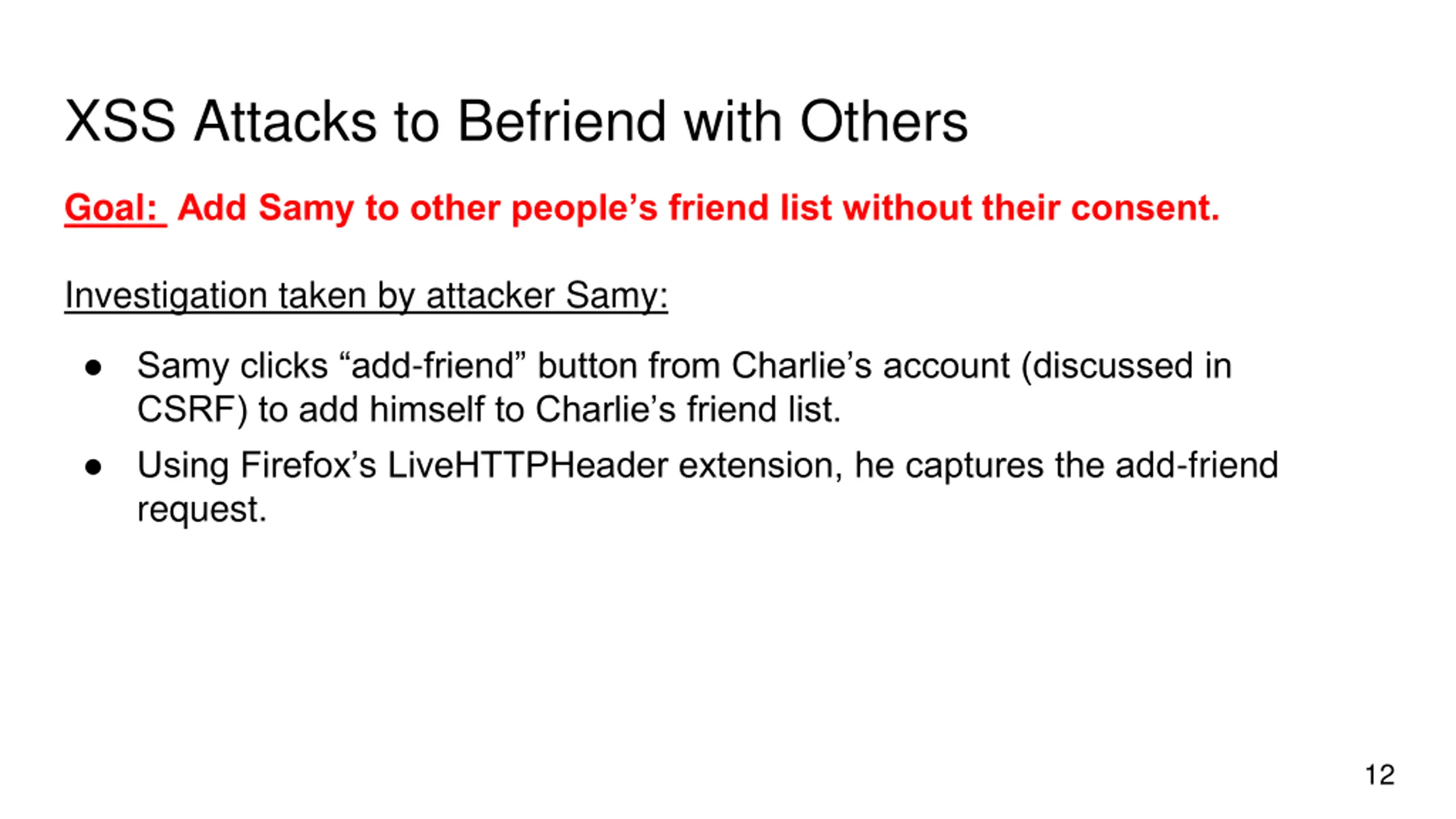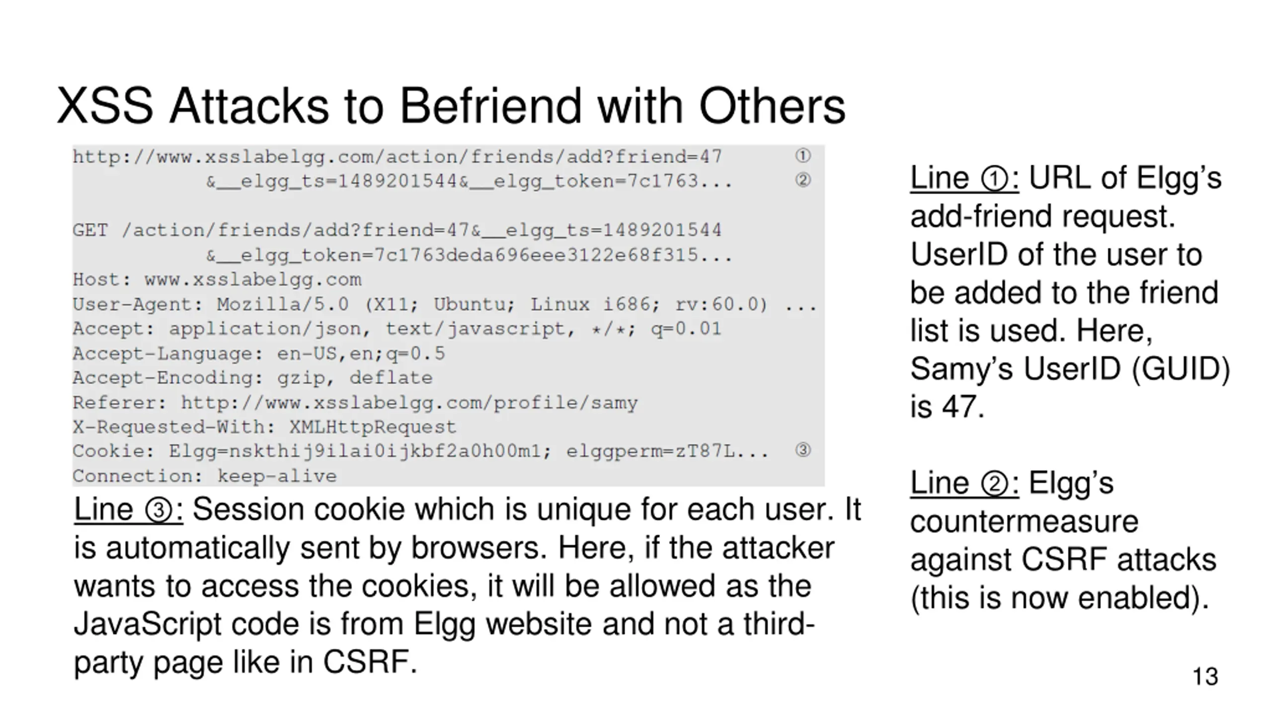 XSS Attacks to Befriend with Others Goal: Add Samy to other people s friend list without their consent. Investigation taken by attacker Samy: Samy clicks add-friend button from Charlie s account (discussed in CSRF) to add himself to Charlie s friend list. Using Firefox s LiveHTTPHeader extension, he captures the add-friend request. 12