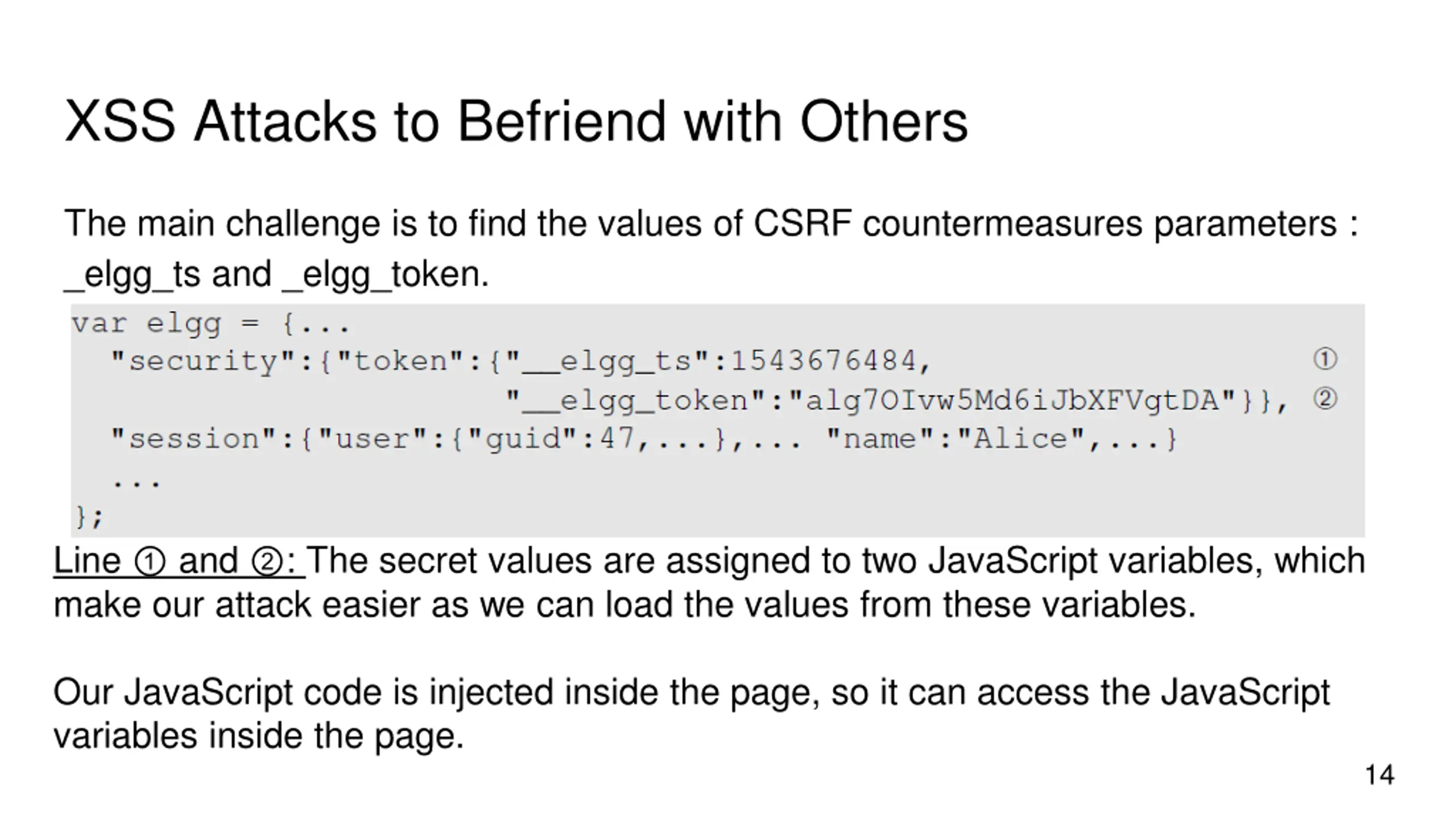XSS Attacks to Befriend with Others The main challenge is to find the values of CSRF countermeasures parameters : _elgg_ts and _elgg_token. Line and : The secret values are assigned to two JavaScript variables, which make our attack easier as we can load the values from these variables. Our JavaScript code is injected inside the page, so it can access the JavaScript variables inside the page. 14