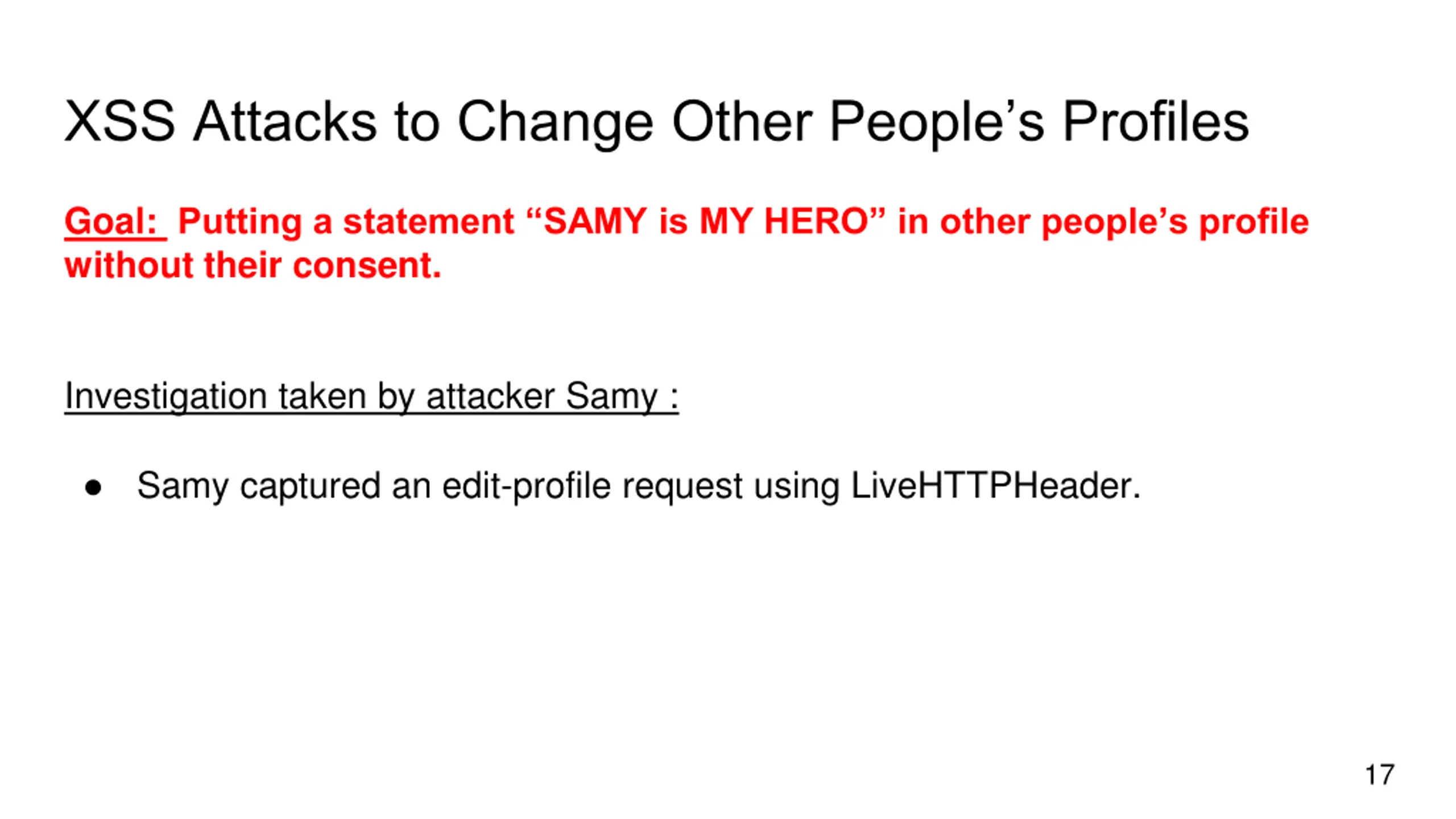 XSS Attacks to Change Other Peoples Profiles Goal: Putting a statement SAMY is MY HERO in other people s profile without their consent. Investigation taken by attacker Samy : Samy captured an edit-profile request using LiveHTTPHeader. 17