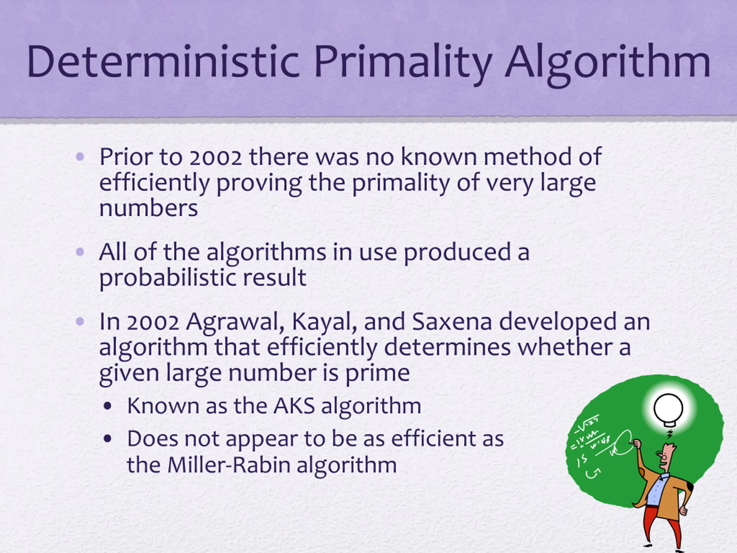 Deterministic Primality Algorithm Prior to 2002 there was no known method of efficiently proving the primality of very large numbers All of the algorithms in use produced a probabilistic result In 2002 Agrawal, Kayal, and Saxena developed an algorithm that efficiently determines whether a given large number is prime Known as the AKS algorithm Does not appear to be as efficient as the Miller-Rabin algorithm
