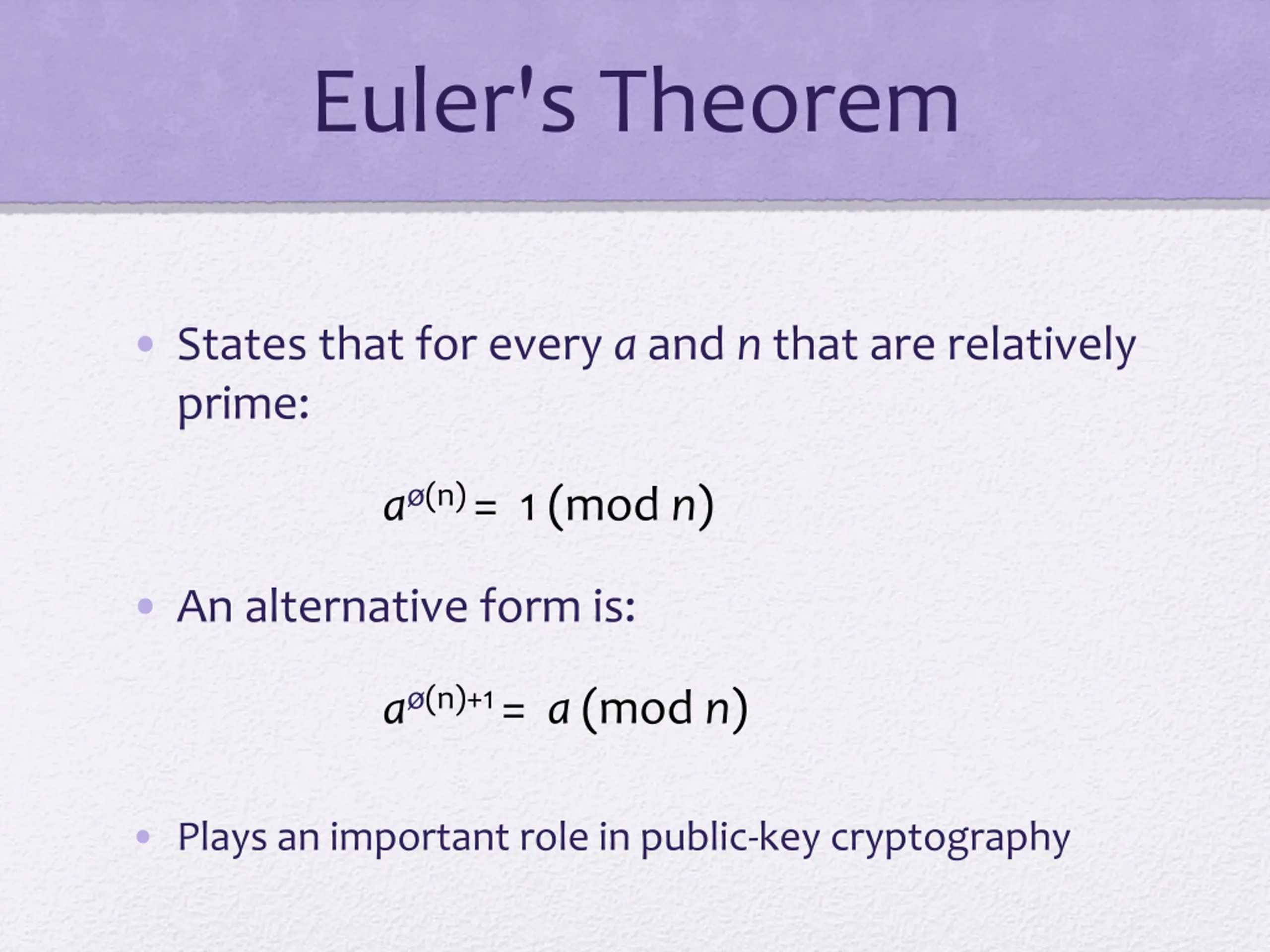Euler's Theorem States that for every a and n that are relatively prime: a (n) = 1 (mod n) An alternative form is: a (n)+1 = a (mod n) Plays an important role in public-key cryptography