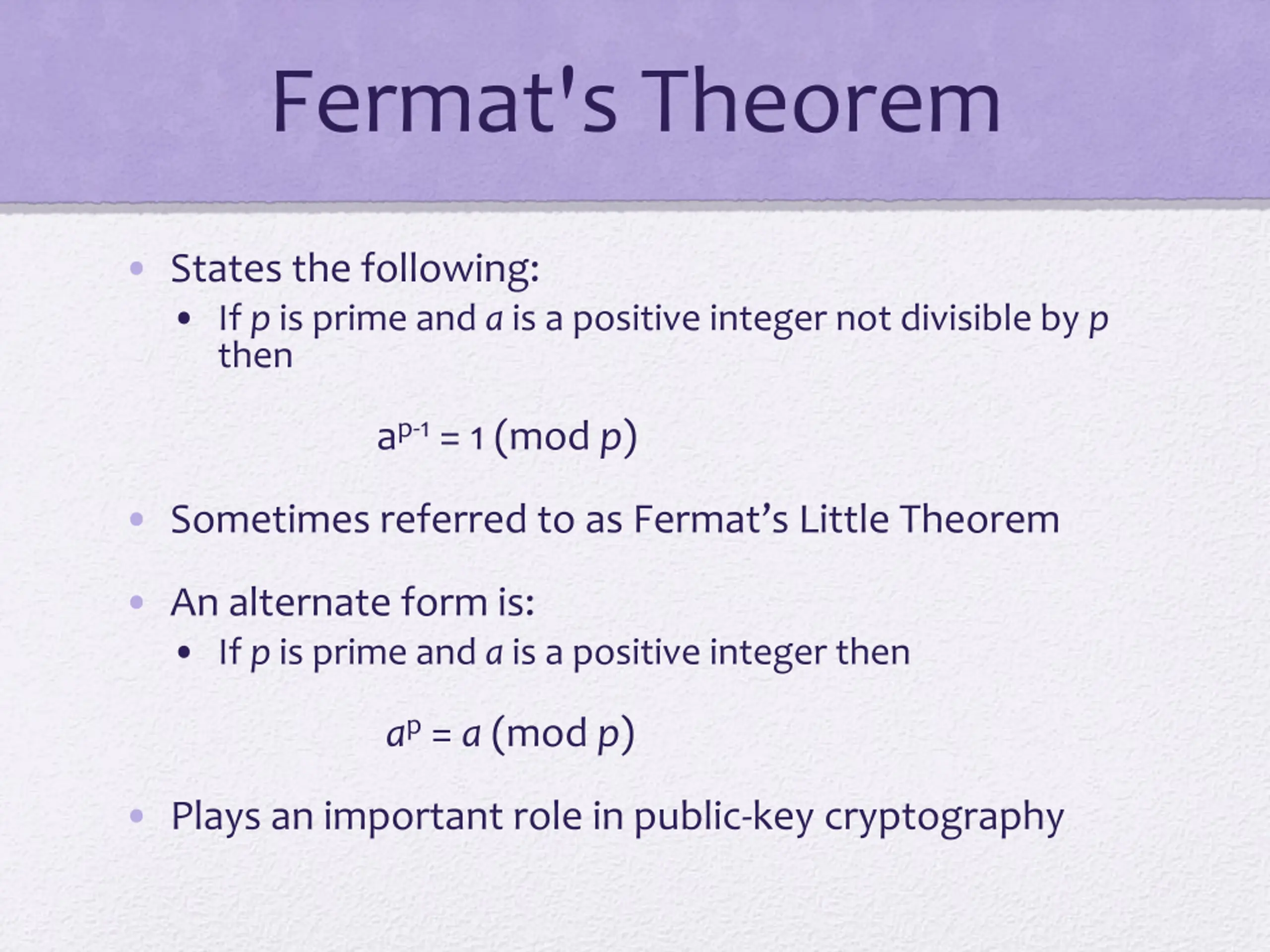 Fermat's Theorem States the following: If p is prime and a is a positive integer not divisible by p then ap-1 = 1 (mod p) Sometimes referred to as Fermat s Little Theorem An alternate form is: If p is prime and a is a positive integer then ap = a (mod p) Plays an important role in public-key cryptography