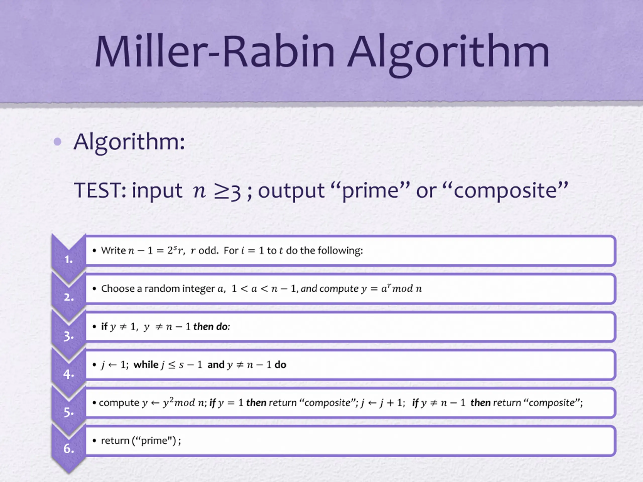 Miller-Rabin Algorithm Algorithm: TEST: input ? 3 ; output prime or composite Write ? 1 = 2??, ? odd. For ? = 1 to ? do the following: 1. Choose a random integer ?, 1 < ? < ? 1, and compute ? = ????? ? 2. if? 1, ? ? 1then do: 3. ? 1; while? ? 1 and? ? 1 do 4. compute ? ?2??? ?; if? = 1thenreturn composite ; ? ? + 1; if? ? 1 thenreturn composite ; 5. return ( prime") ; 6.