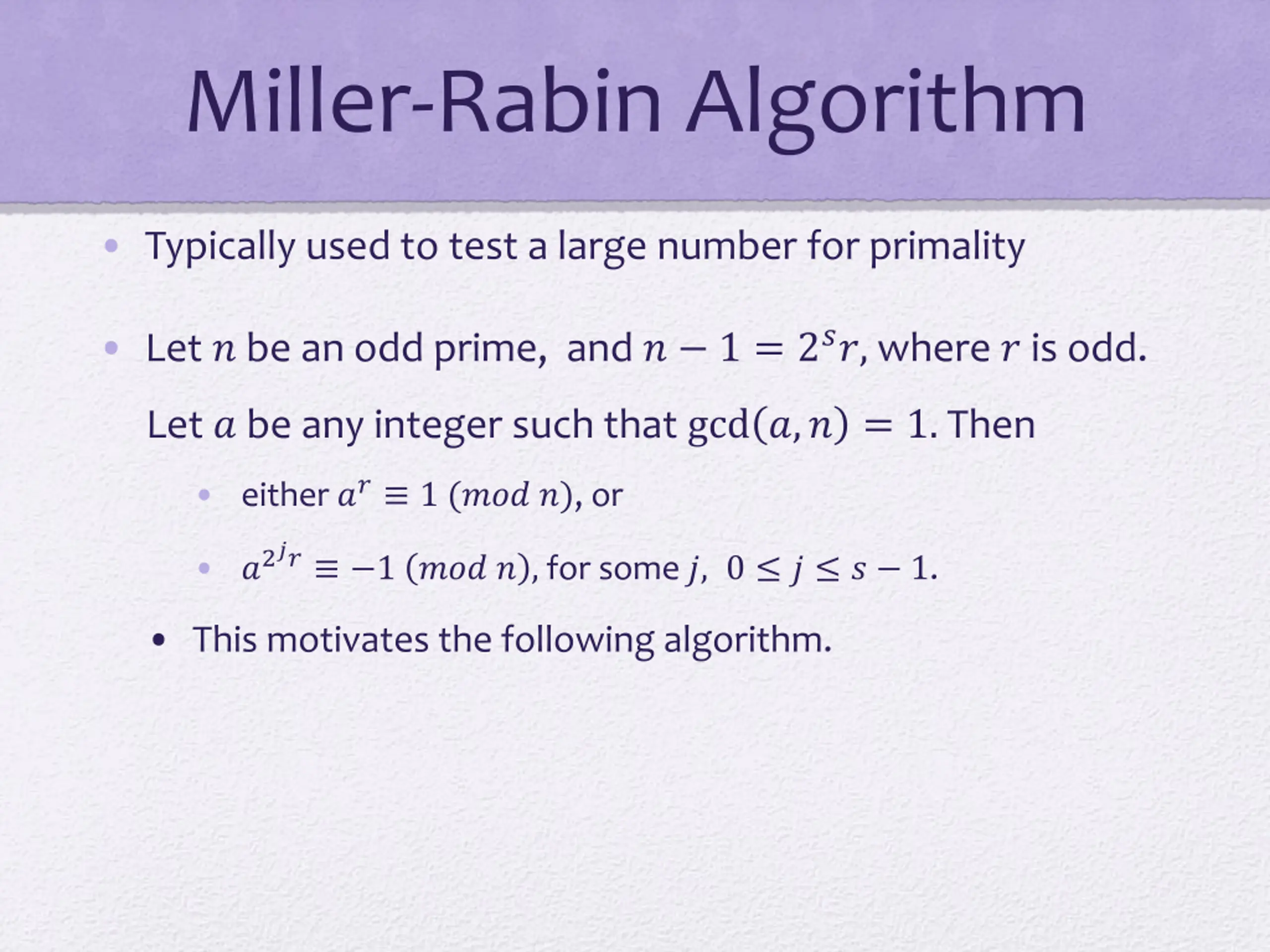 Miller-Rabin Algorithm Typically used to test a large number for primality Let ? be an odd prime, and ? 1 = 2??, where ? is odd. Let ? be any integer such that gcd ?,? = 1. Then either ?? 1 (??? ?), or ?2?? 1 ??? ? , for some ?, 0 ? ? 1. This motivates the following algorithm.