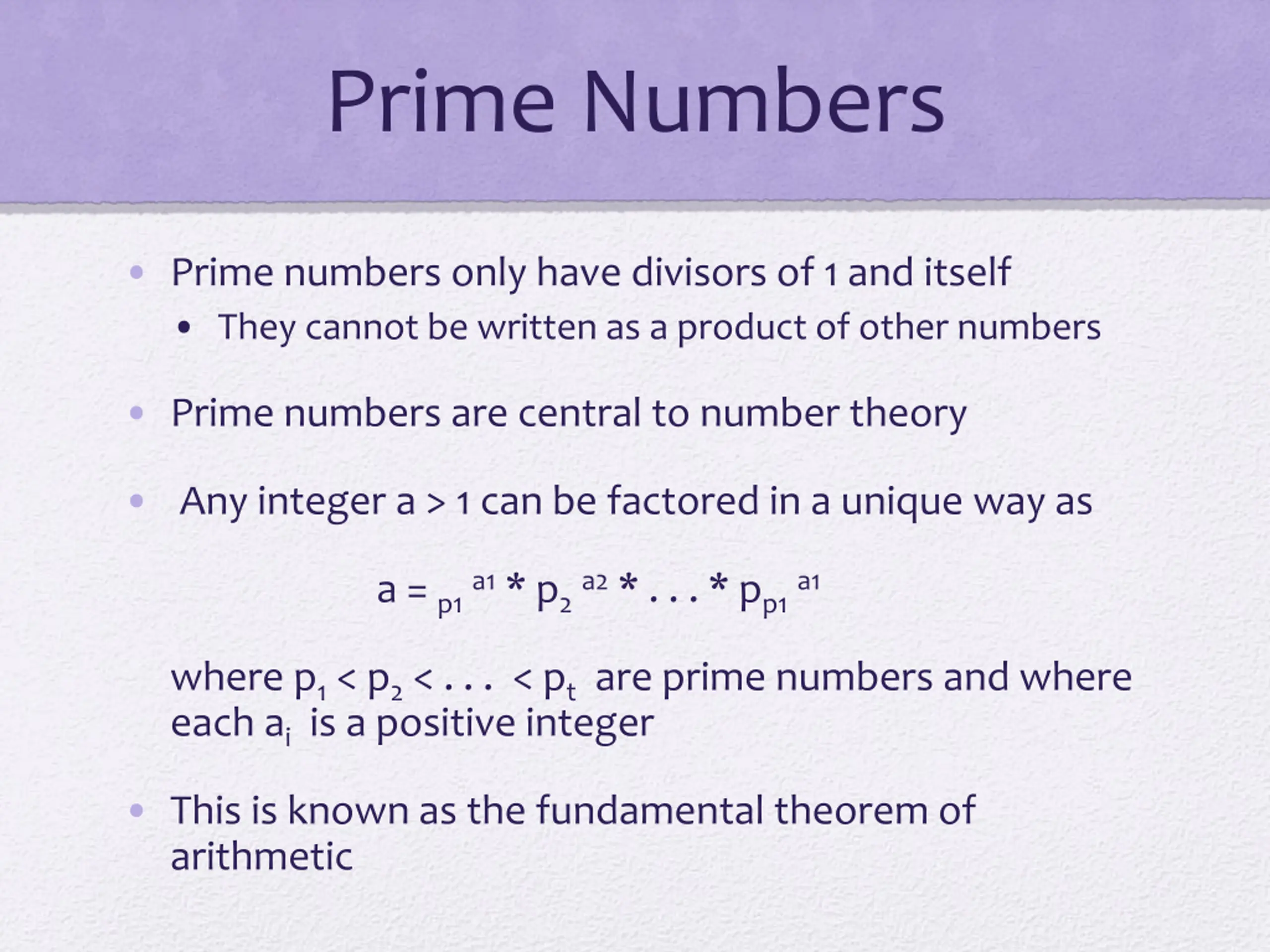 Prime Numbers Prime numbers only have divisors of 1 and itself They cannot be written as a product of other numbers Prime numbers are central to number theory Any integer a > 1 can be factored in a unique way as a = p1a1* p2a2* . . . * pp1a1 where p1< p2< . . . < ptare prime numbers and where each aiis a positive integer This is known as the fundamental theorem of arithmetic
