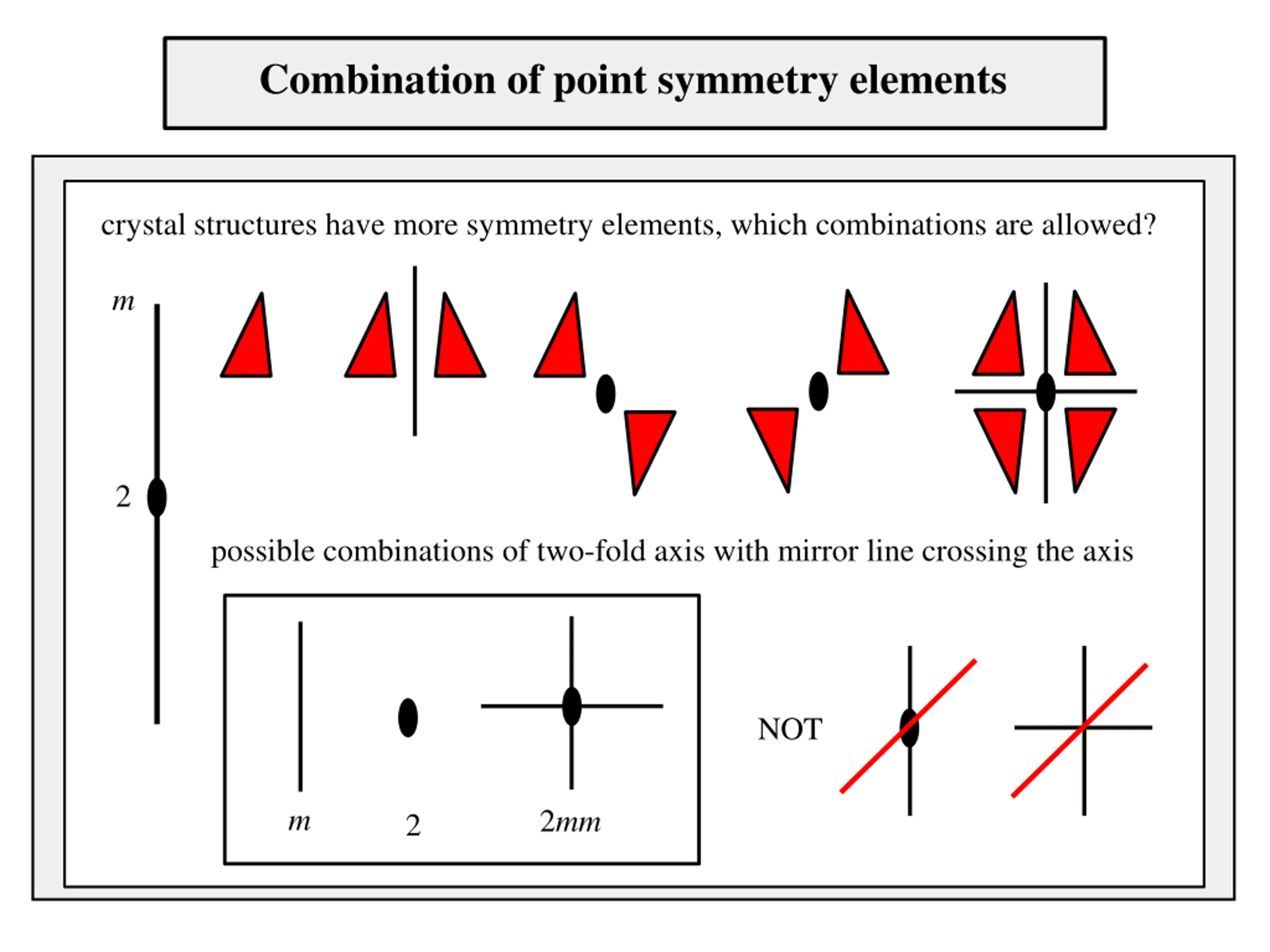 Combination of point symmetry elements crystal structures have more symmetry elements, which combinations are allowed? m 2 possible combinations of two-fold axis with mirror line crossing the axis NOT m 2mm 2