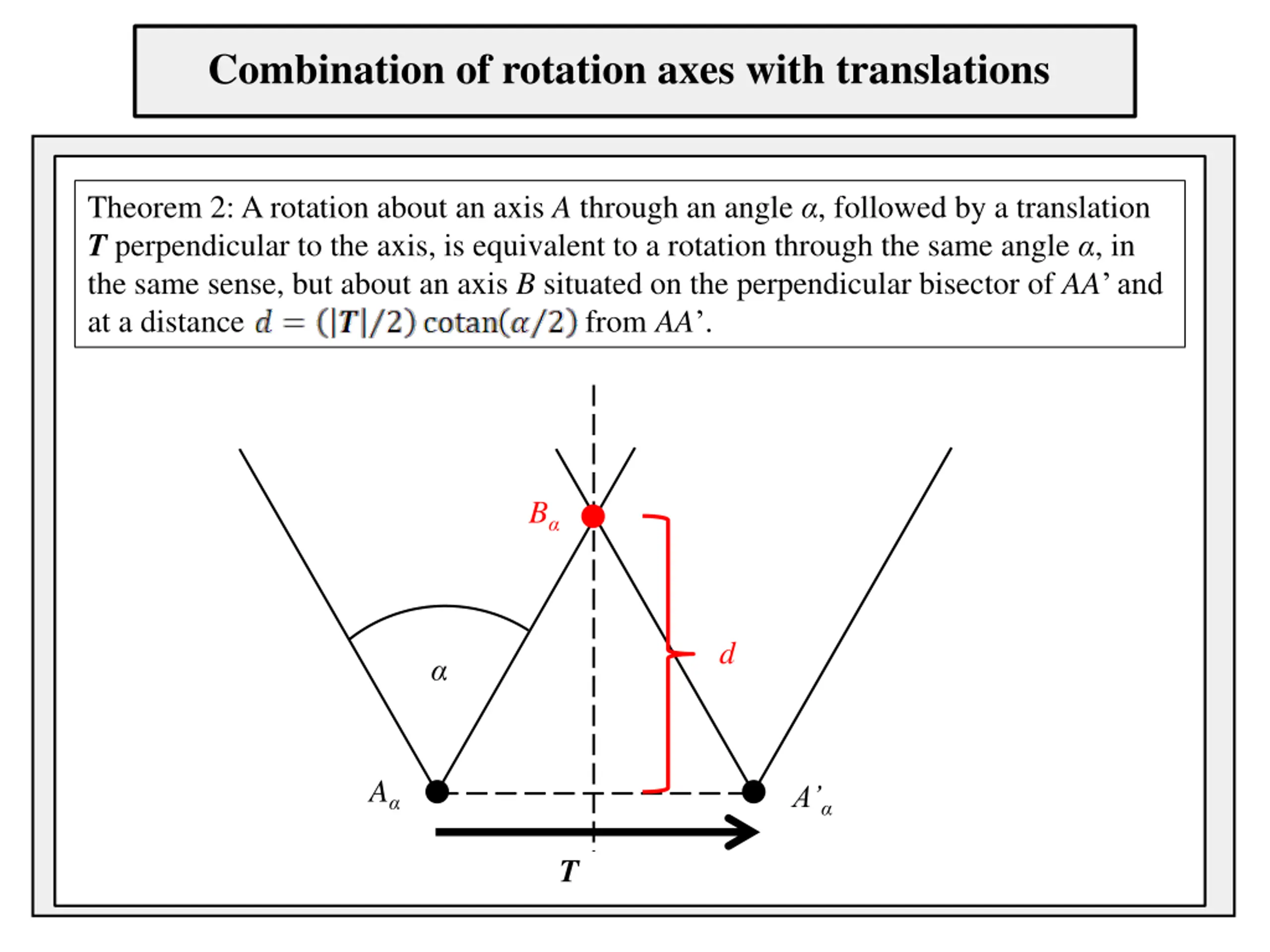 Combination of rotation axes with translations Theorem 2: A rotation about an axis A through an angle , followed by a translation T perpendicular to the axis, is equivalent to a rotation through the same angle , in the same sense, but about an axis B situated on the perpendicular bisector of AA and at a distance from AA . B d A A T
