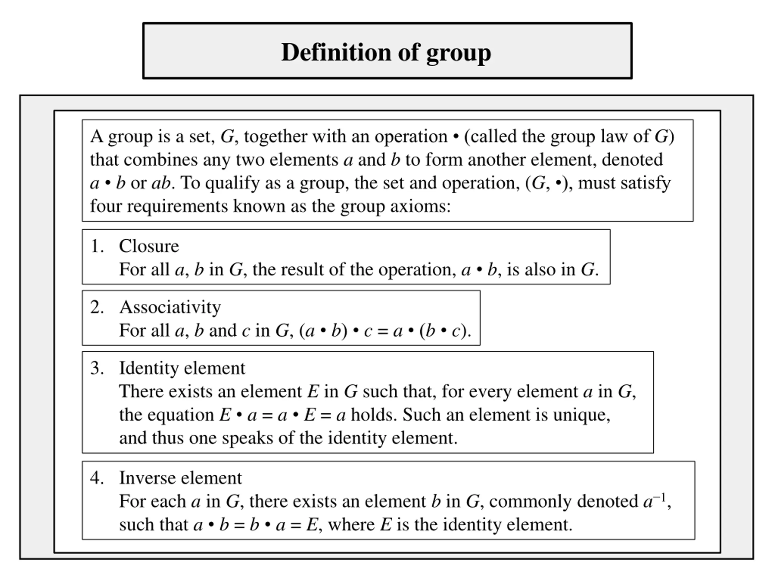 Definition of group A group is a set, G, together with an operation (called the group law of G) that combines any two elements a and b to form another element, denoted a b or ab. To qualify as a group, the set and operation, (G, ), must satisfy four requirements known as the group axioms: 1. Closure For all a, b in G, the result of the operation, a b, is also in G. 2. Associativity For all a, b and c in G, (a b) c = a (b c). 3. Identity element There exists an element E in G such that, for every element a in G, the equation E a = a E = a holds. Such an element is unique, and thus one speaks of the identity element. 4. Inverse element For each a in G, there exists an element b in G, commonly denoted a 1, such that a b = b a = E, where E is the identity element.