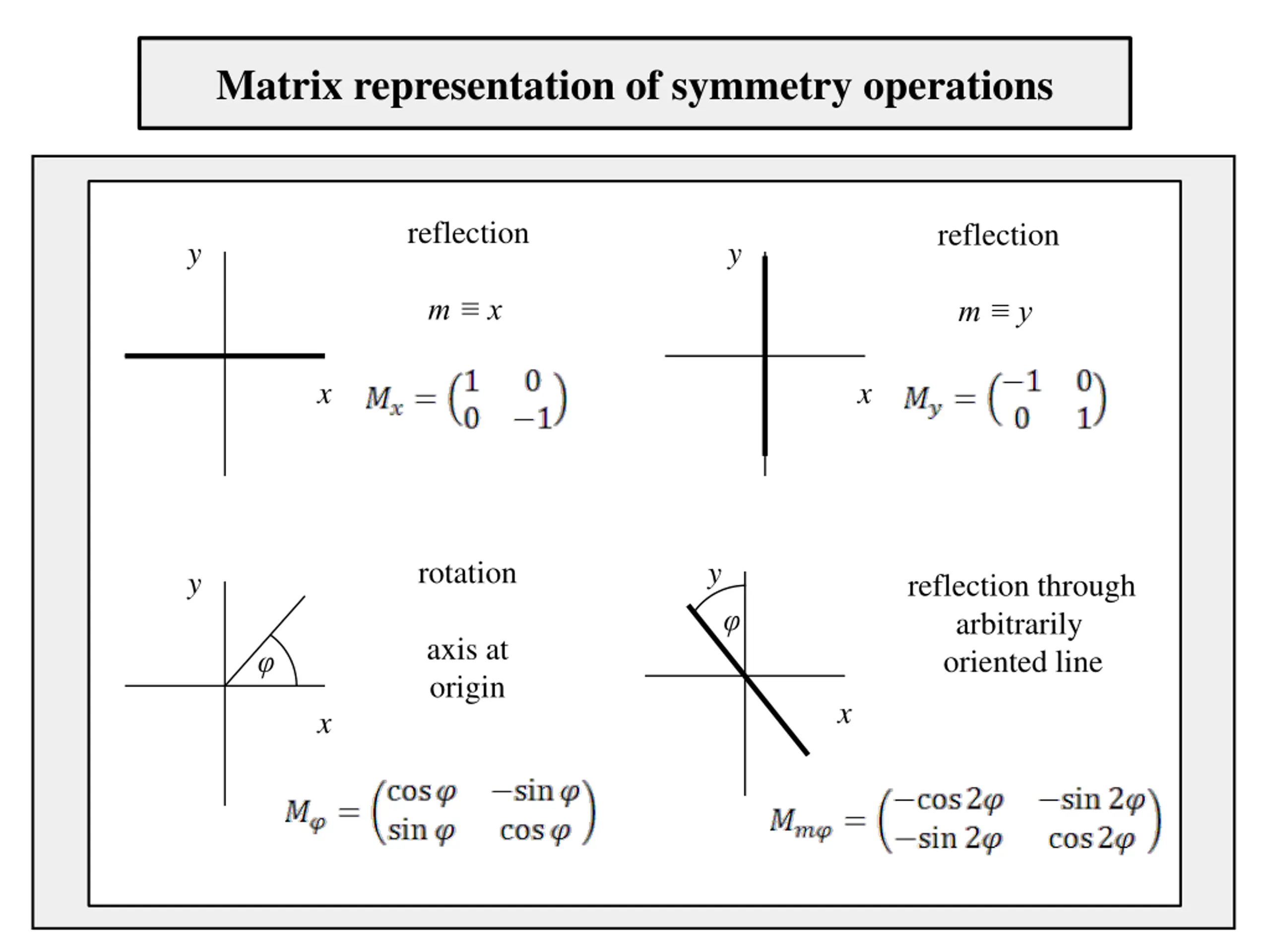 Matrix representation of symmetry operations reflection reflection y y m x m y x x rotation y y reflection through arbitrarily oriented line axis at origin x x