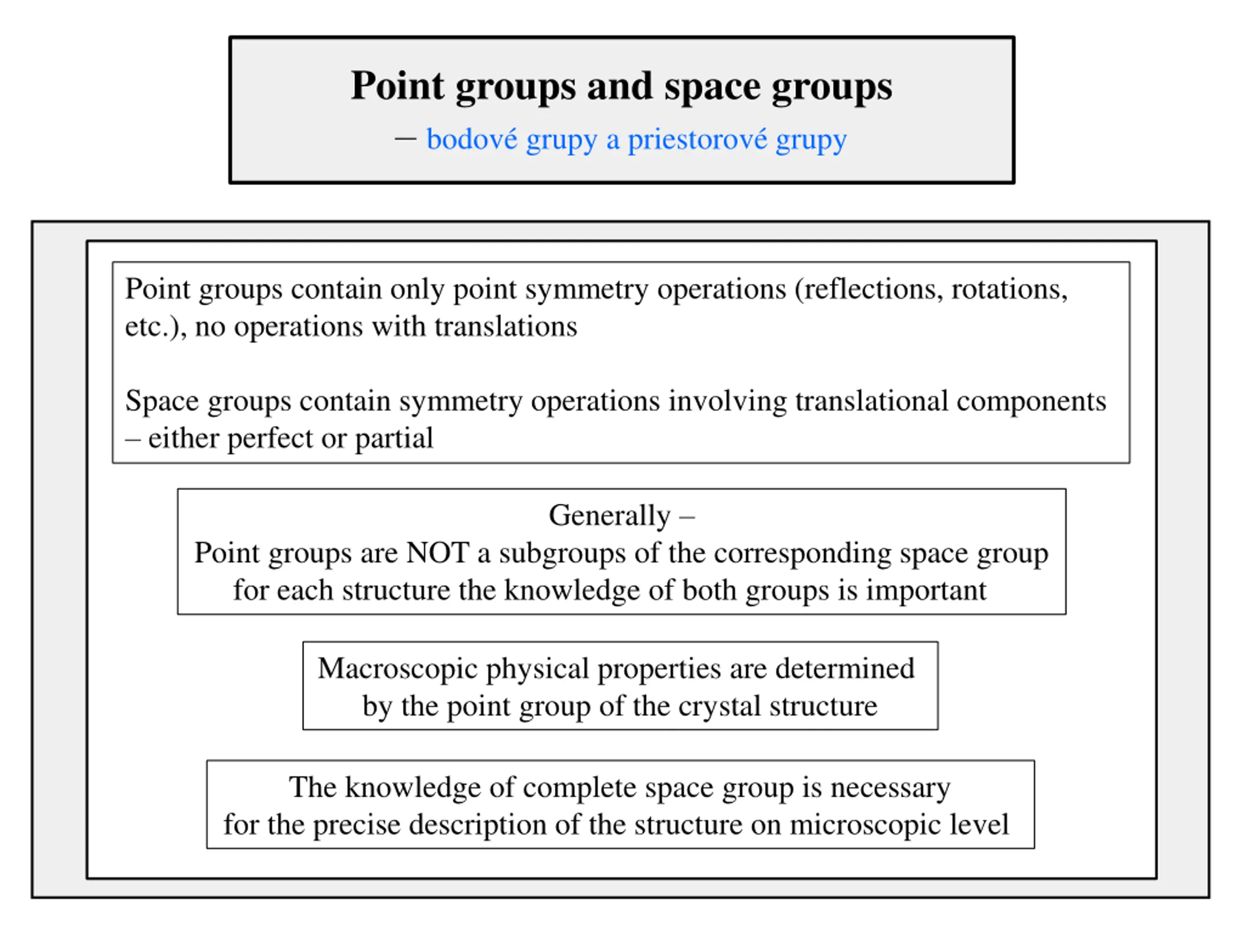 Point groups and space groups bodov grupy a priestorov grupy Point groups contain only point symmetry operations (reflections, rotations, etc.), no operations with translations Space groups contain symmetry operations involving translational components either perfect or partial Generally Point groups are NOT a subgroups of the corresponding space group for each structure the knowledge of both groups is important Macroscopic physical properties are determined by the point group of the crystal structure The knowledge of complete space group is necessary for the precise description of the structure on microscopic level