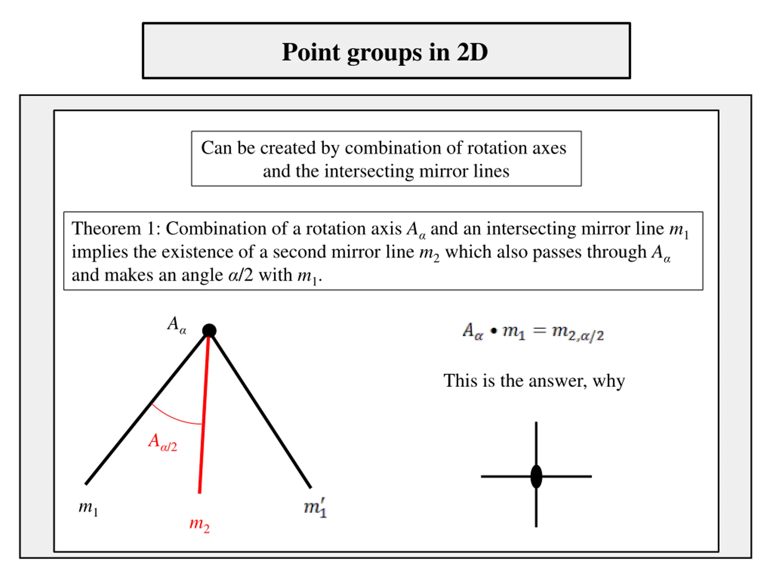 Point groups in 2D Can be created by combination of rotation axes and the intersecting mirror lines Theorem 1: Combination of a rotation axis A and an intersecting mirror line m1 implies the existence of a second mirror line m2which also passes through A and makes an angle /2 with m1. A This is the answer, why A /2 m1 m2