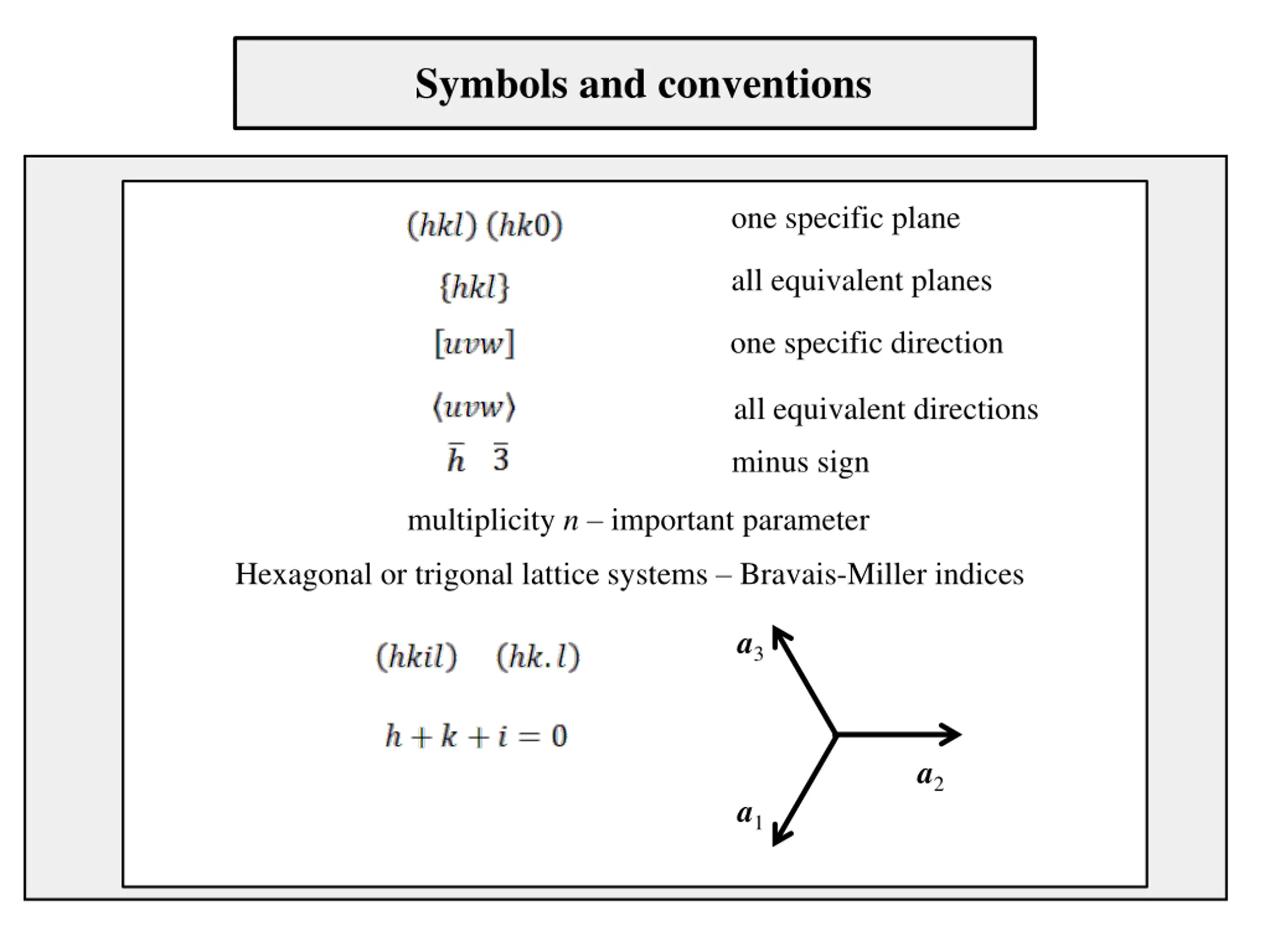 Symbols and conventions one specific plane all equivalent planes one specific direction all equivalent directions minus sign multiplicity n important parameter Hexagonal or trigonal lattice systems Bravais-Miller indices a3 a2 a1