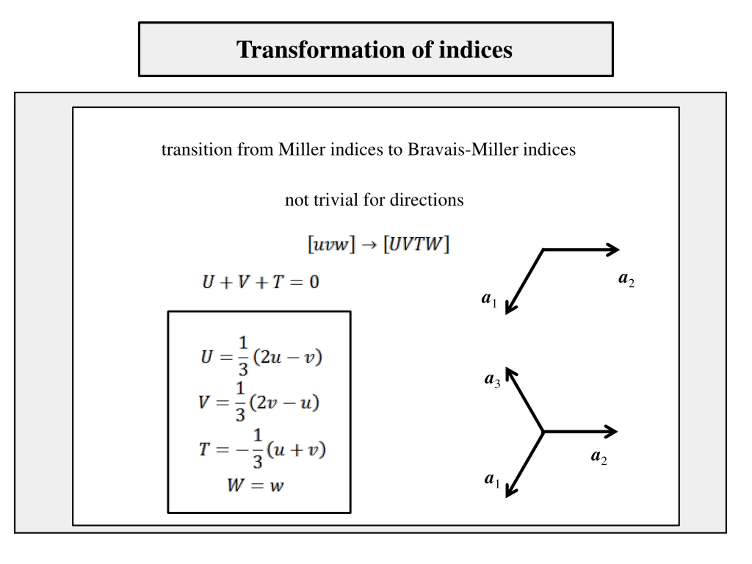 Transformation of indices transition from Miller indices to Bravais-Miller indices not trivial for directions a2 a1 a3 a2 a1