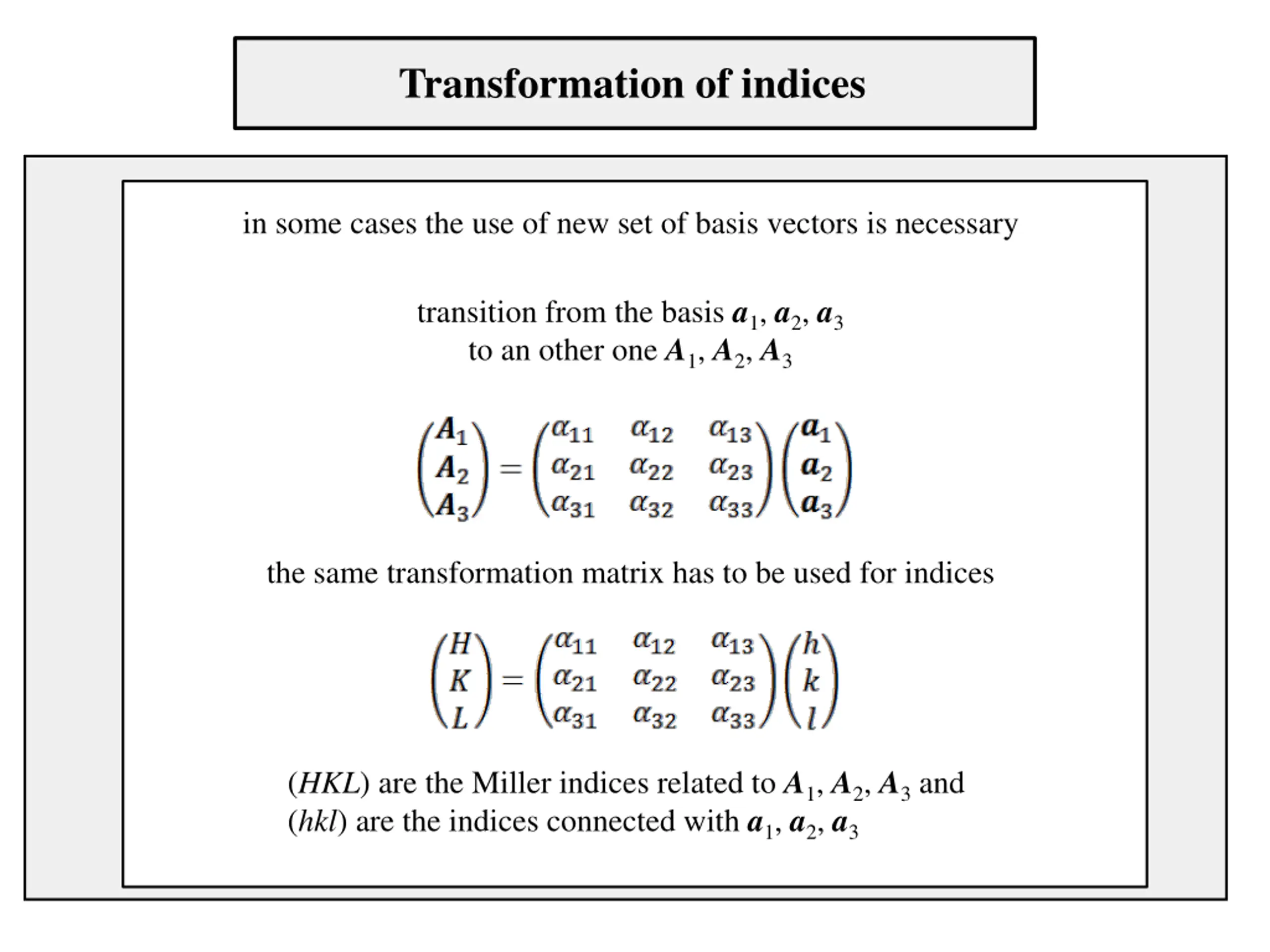 Transformation of indices in some cases the use of new set of basis vectors is necessary transition from the basis a1, a2, a3 to an other one A1, A2, A3 the same transformation matrix has to be used for indices (HKL) are the Miller indices related to A1, A2, A3and (hkl) are the indices connected with a1, a2, a3