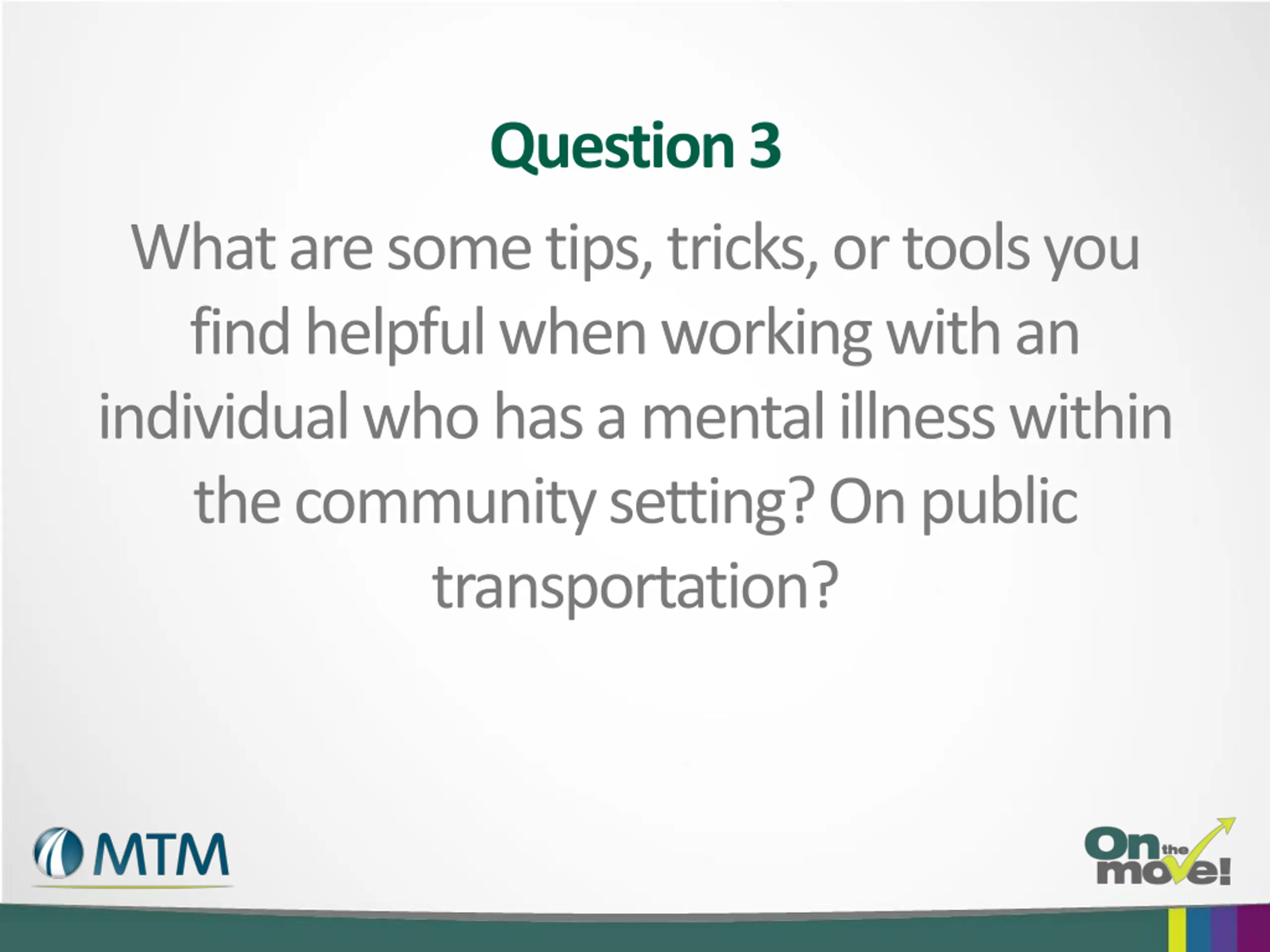 Question 3 What are some tips, tricks, or tools you find helpful when working with an individual who has a mental illness within the community setting? On public transportation?