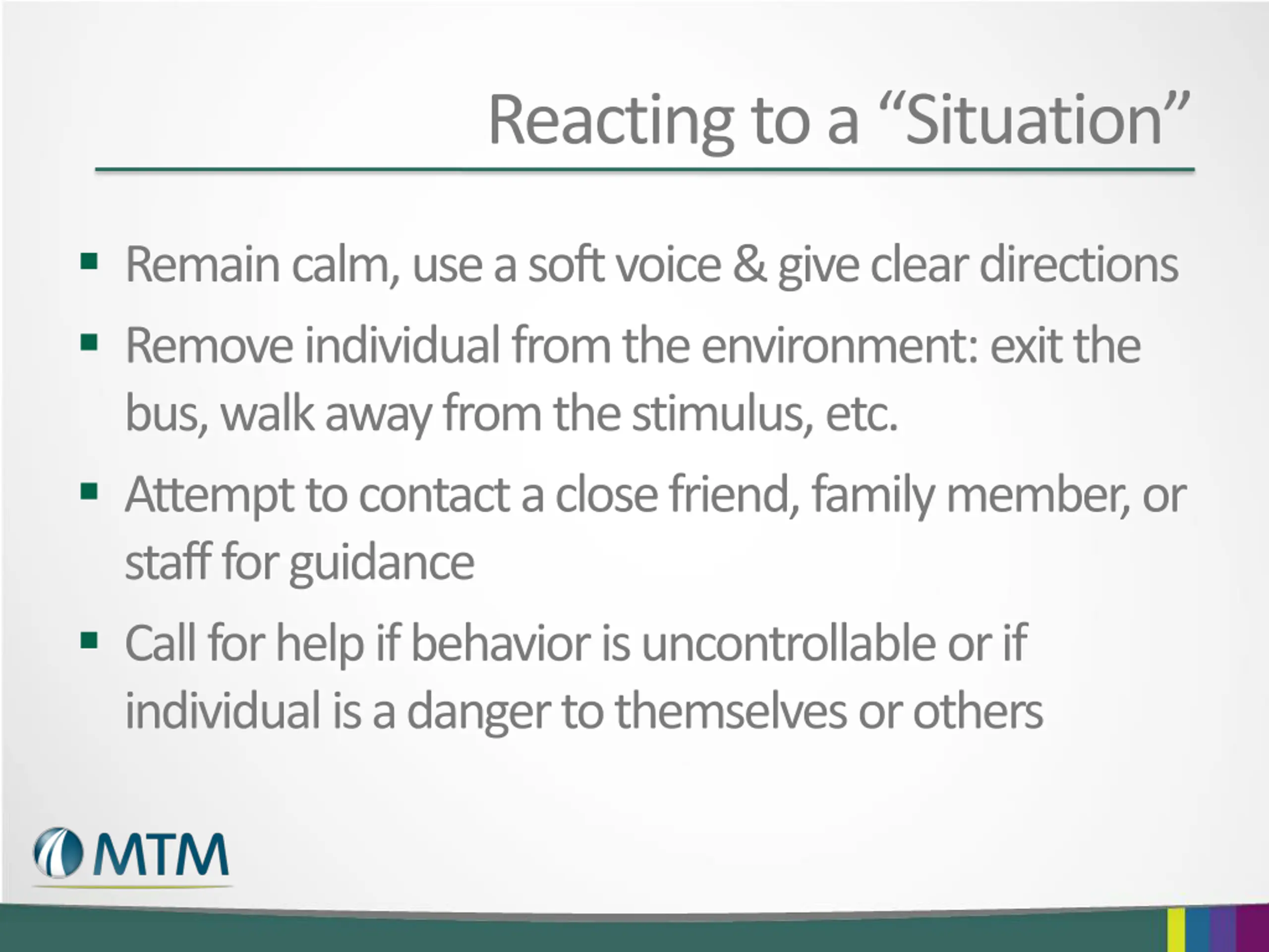 Reacting to a Situation Remain calm, use a soft voice & give clear directions Remove individual from the environment: exit the bus, walk away from the stimulus, etc. Attempt to contact a close friend, family member, or staff for guidance Call for help if behavior is uncontrollable or if individual is a danger to themselves or others