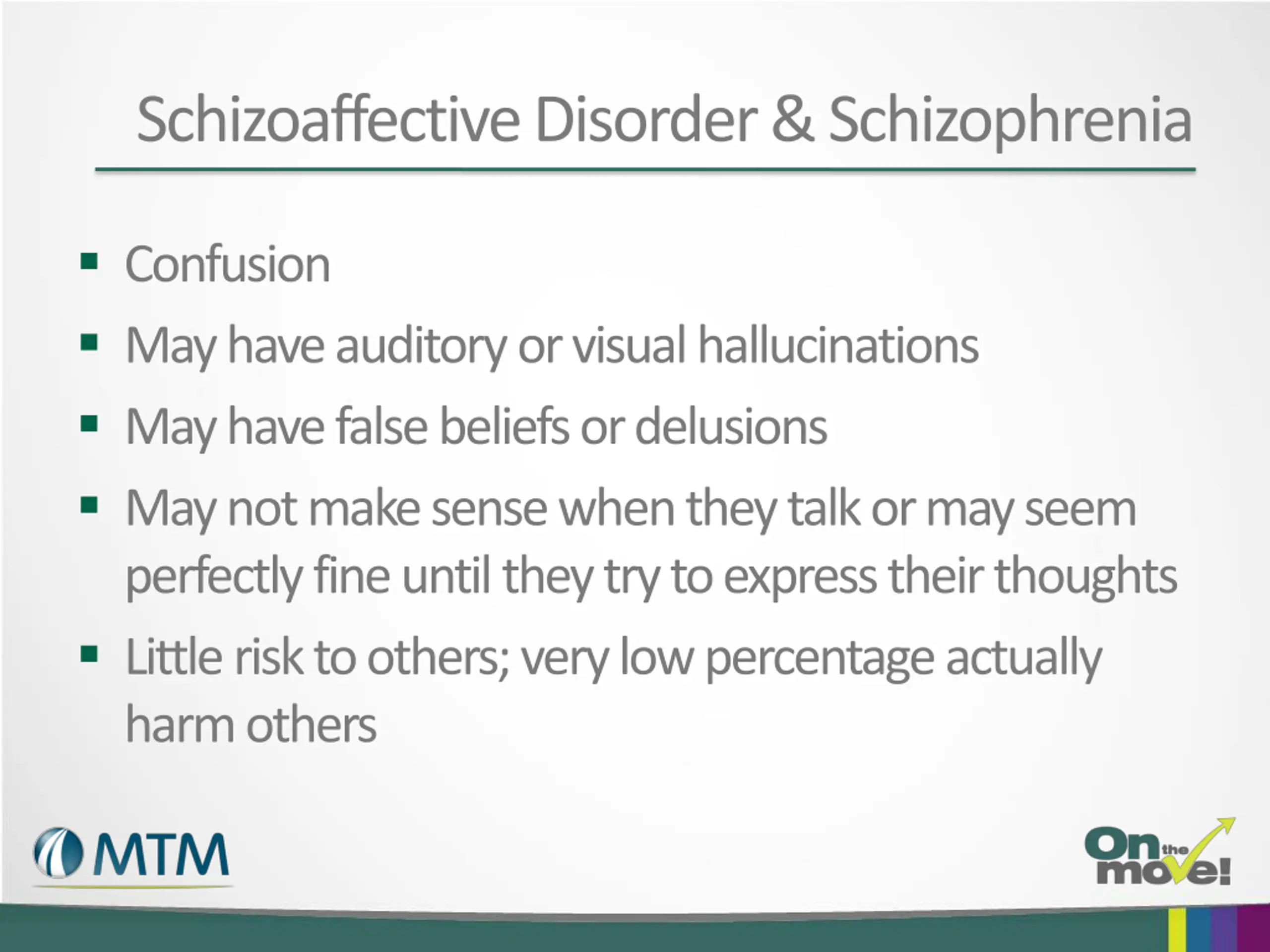 Schizoaffective Disorder & Schizophrenia Confusion May have auditory or visual hallucinations May have false beliefs or delusions May not make sense when they talk or may seem perfectly fine until they try to express their thoughts Little risk to others; very low percentage actually harm others