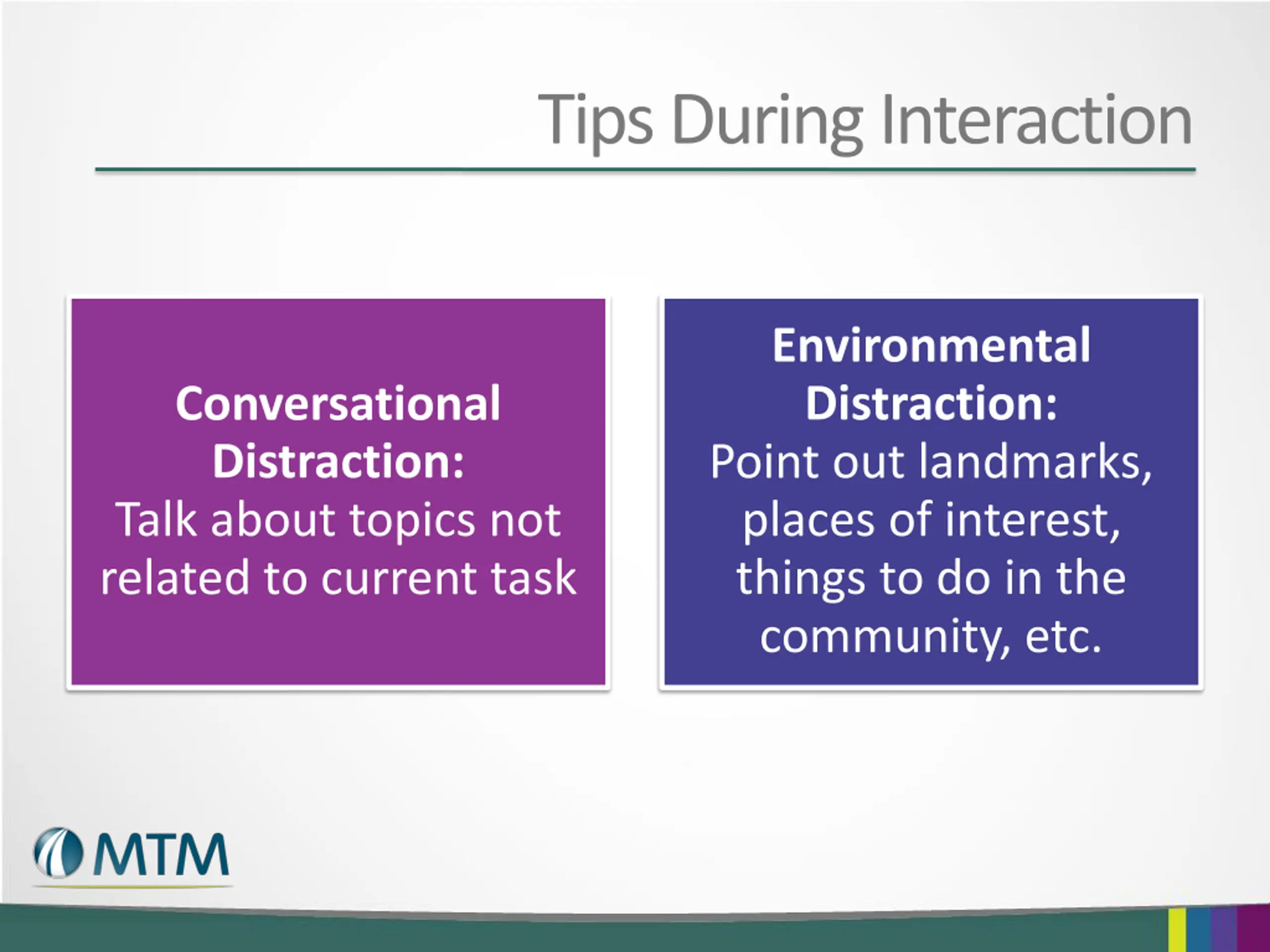 Tips During Interaction Environmental Distraction: Point out landmarks, places of interest, things to do in the community, etc. Conversational Distraction: Talk about topics not related to current task