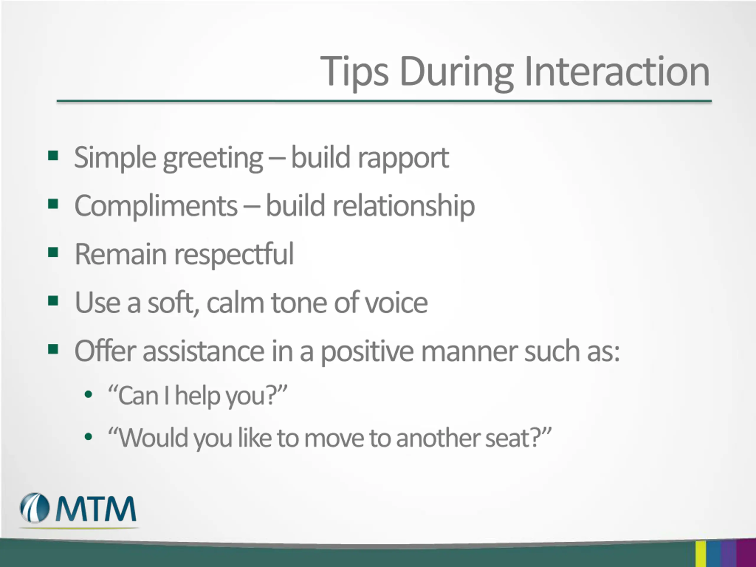Tips During Interaction Simple greeting build rapport Compliments build relationship Remain respectful Use a soft, calm tone of voice Offer assistance in a positive manner such as: Can I help you? Would you like to move to another seat?