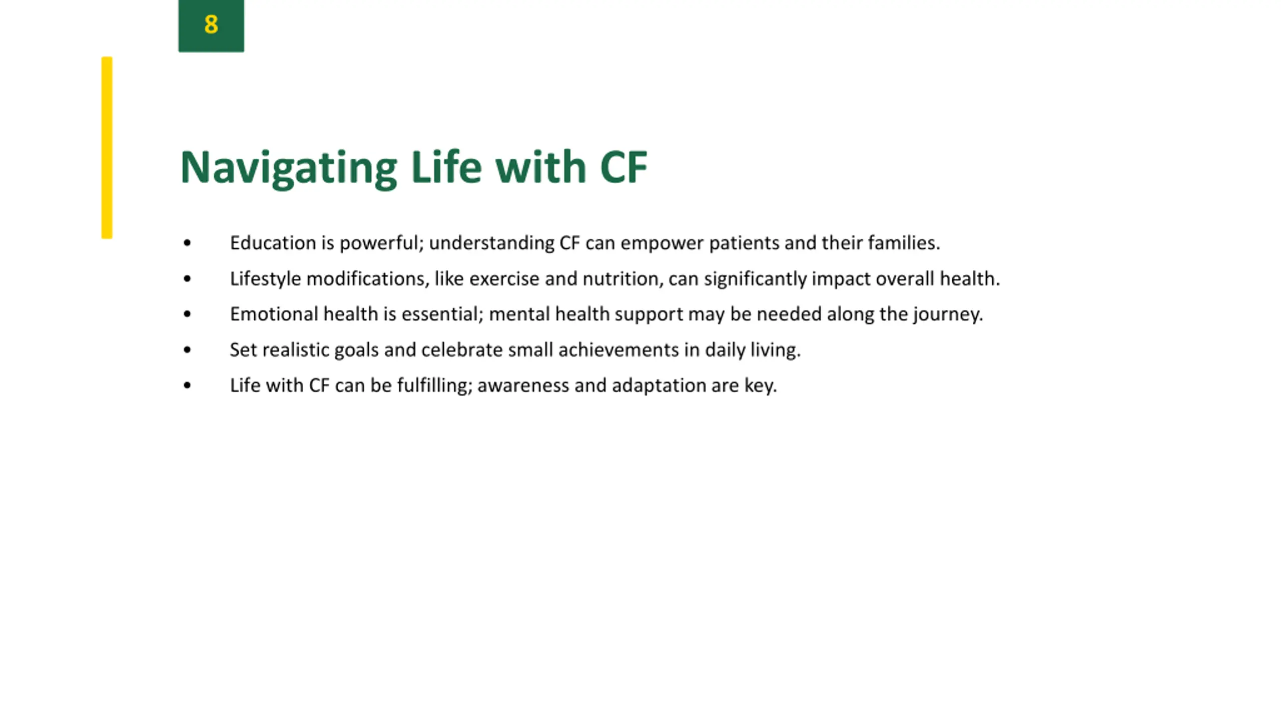 8 Navigating Life with CF Education is powerful; understanding CF can empower patients and their families. Lifestyle modifications, like exercise and nutrition, can significantly impact overall health. Emotional health is essential; mental health support may be needed along the journey. Set realistic goals and celebrate small achievements in daily living. Life with CF can be fulfilling; awareness and adaptation are key.