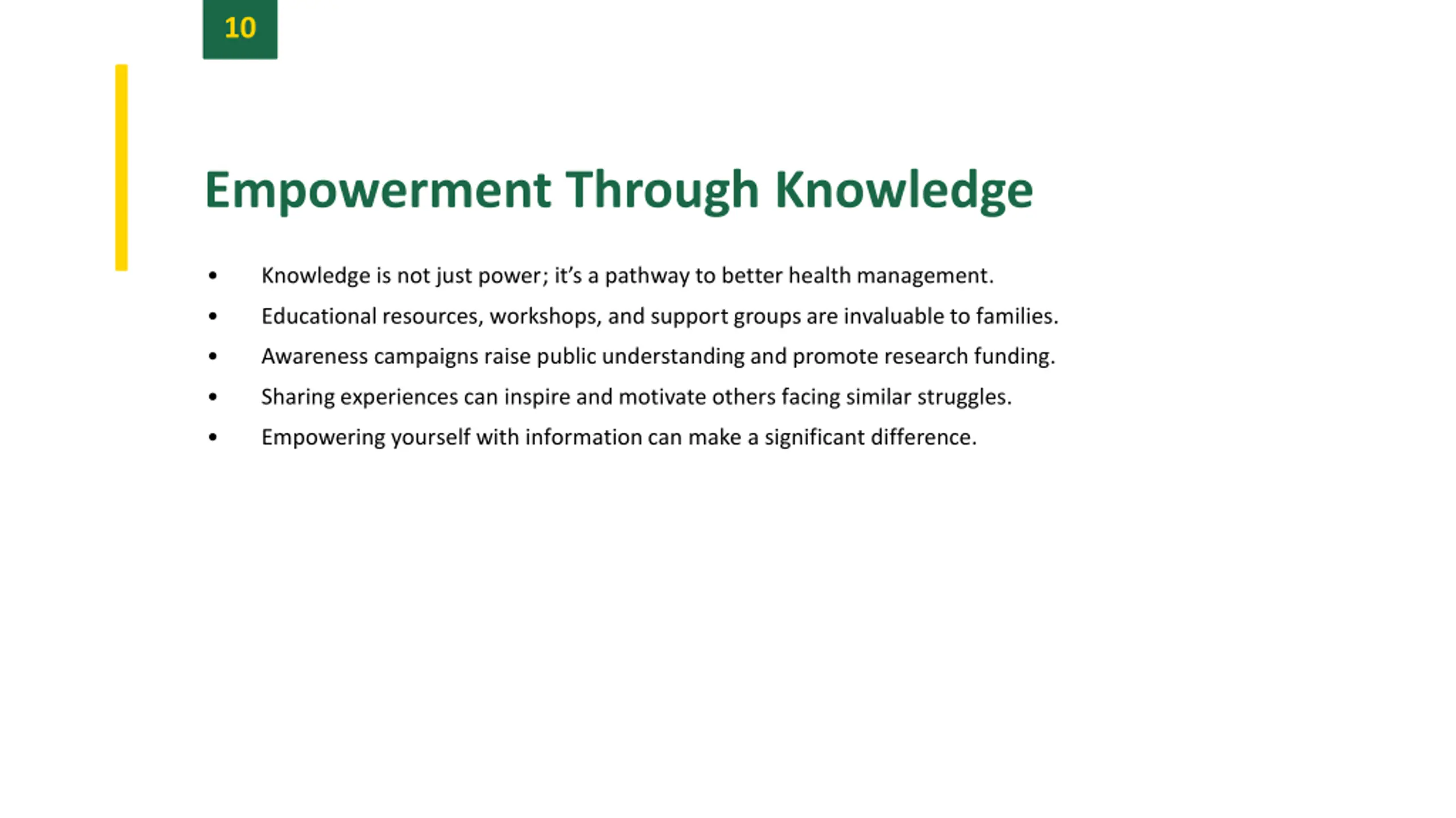 10 Empowerment Through Knowledge Knowledge is not just power; it s a pathway to better health management. Educational resources, workshops, and support groups are invaluable to families. Awareness campaigns raise public understanding and promote research funding. Sharing experiences can inspire and motivate others facing similar struggles. Empowering yourself with information can make a significant difference.