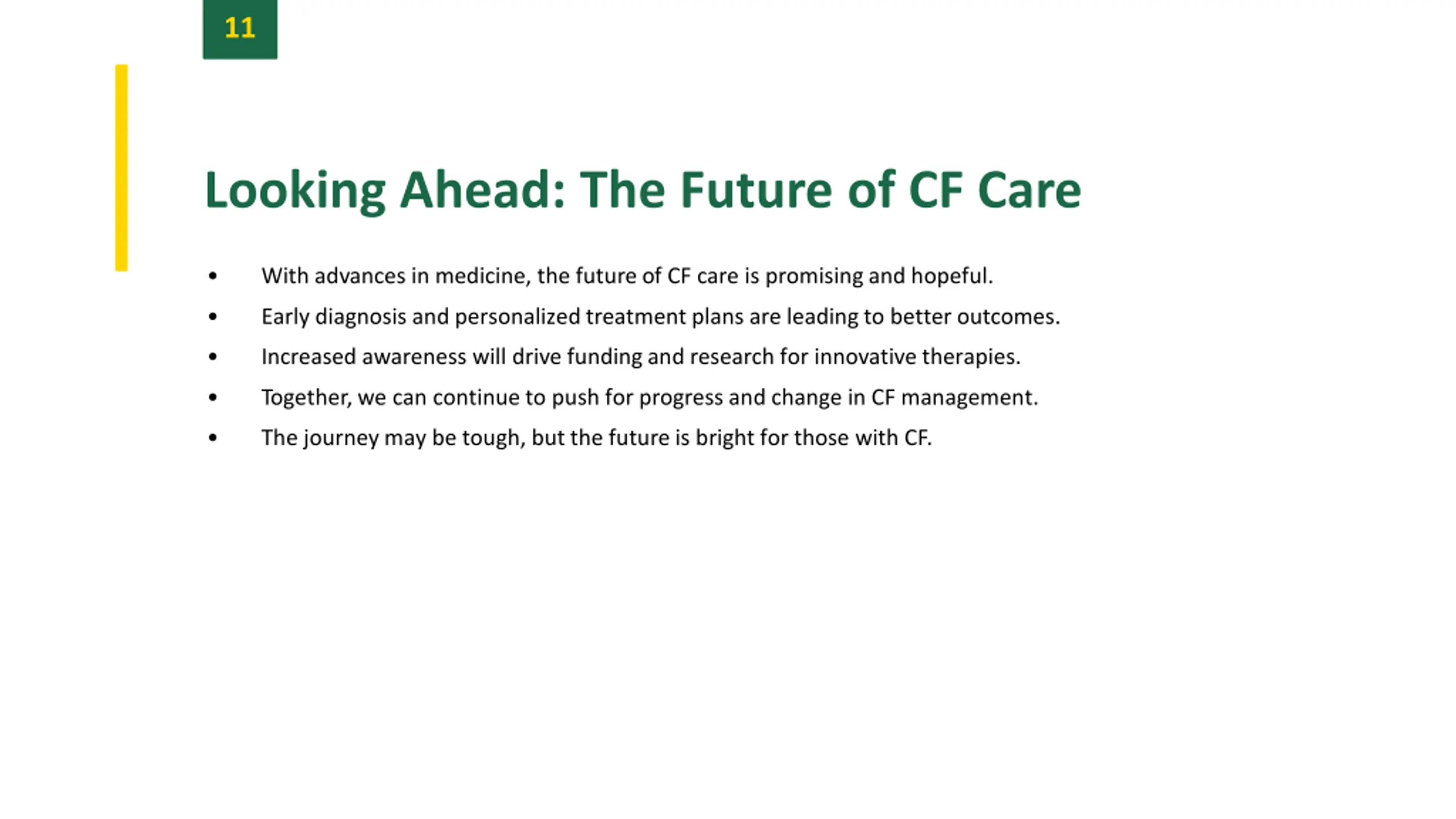 11 Looking Ahead: The Future of CF Care With advances in medicine, the future of CF care is promising and hopeful. Early diagnosis and personalized treatmentplans are leading to better outcomes. Increased awareness will drive fundingand research for innovative therapies. Together, we can continue to push for progress and change in CF management. The journey may be tough, but the future is bright for those with CF.