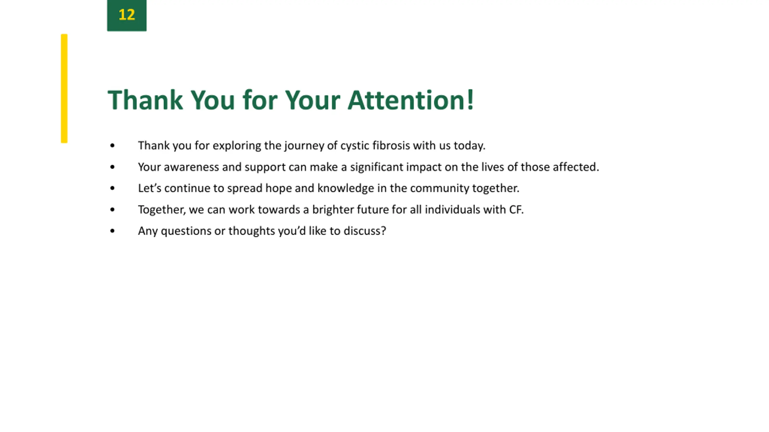 12 Thank You for Your Attention! Thank you for exploring the journey of cystic fibrosis with us today. Your awareness and support can make a significant impact on the lives of those affected. Let s continue to spread hope and knowledge in the community together. Together, we can work towards a brighterfuturefor all individuals with CF. Any questions or thoughts you d like to discuss?