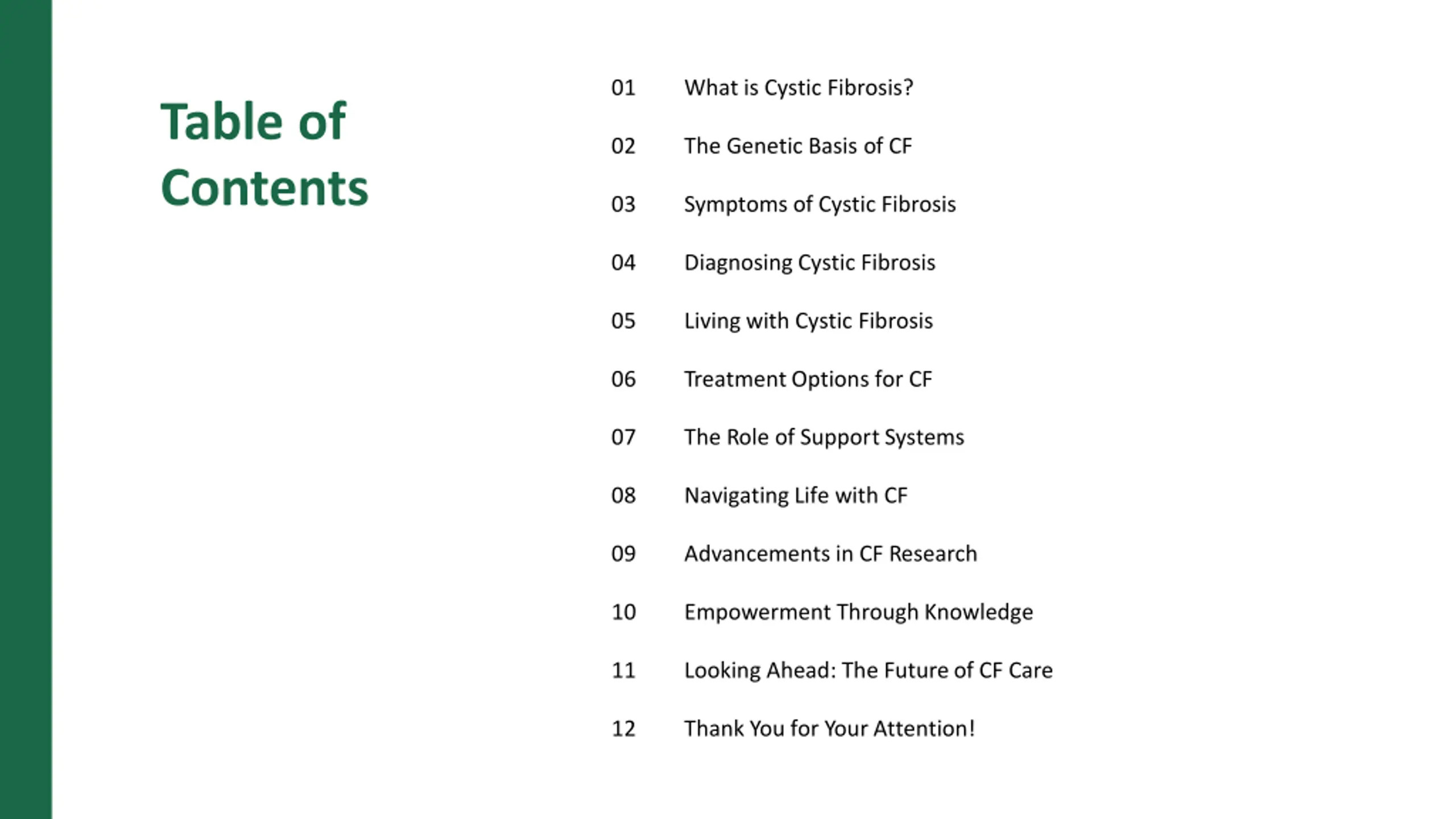 01 What is Cystic Fibrosis? Table of Contents 02 The Genetic Basis of CF 03 Symptoms of Cystic Fibrosis 04 Diagnosing Cystic Fibrosis 05 Living with Cystic Fibrosis 06 Treatment Options for CF 07 The Role of Support Systems 08 Navigating Life with CF 09 Advancements in CF Research 10 Empowerment Through Knowledge 11 Looking Ahead: The Future of CF Care 12 Thank You for Your Attention!