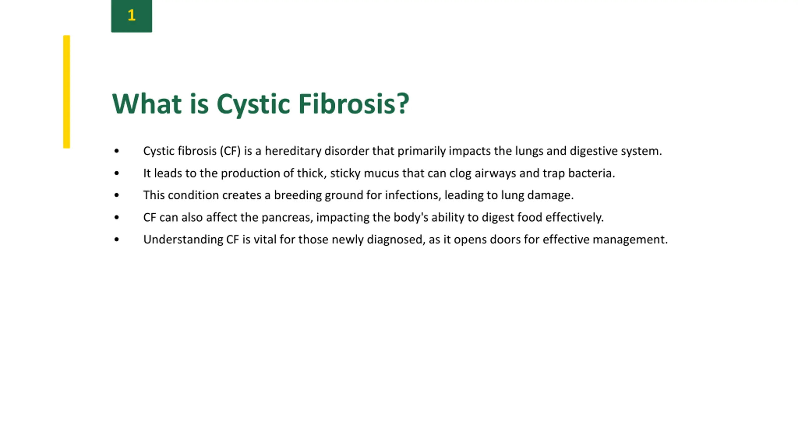 1 What is Cystic Fibrosis? Cystic fibrosis (CF) is a hereditary disorder that primarily impacts the lungs and digestive system. It leads to the production of thick, sticky mucus that can clog airways and trap bacteria. This condition creates a breeding groundfor infections, leading to lung damage. CF can also affect the pancreas, impacting the body's ability to digest food effectively. Understanding CF is vital for those newly diagnosed, as it opens doors for effective management.