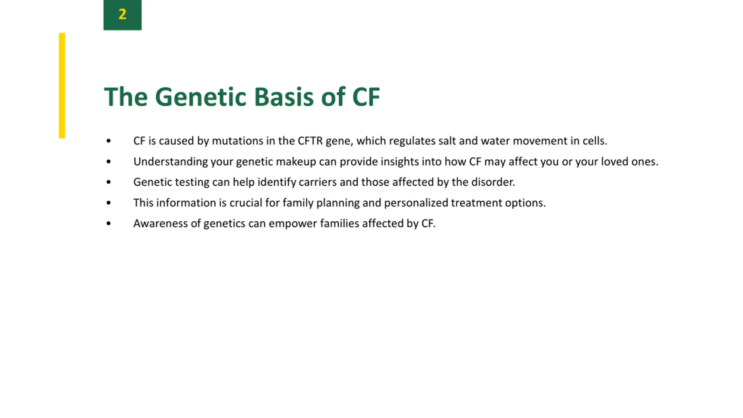 2 The Genetic Basis of CF CF is caused by mutations in the CFTR gene, which regulates salt and water movement in cells. Understanding your genetic makeup can provide insights into how CF may affect you or your loved ones. Genetic testing can help identifycarriers and those affected by the disorder. This information is crucial for family planning and personalized treatmentoptions. Awareness of genetics can empower families affected by CF.