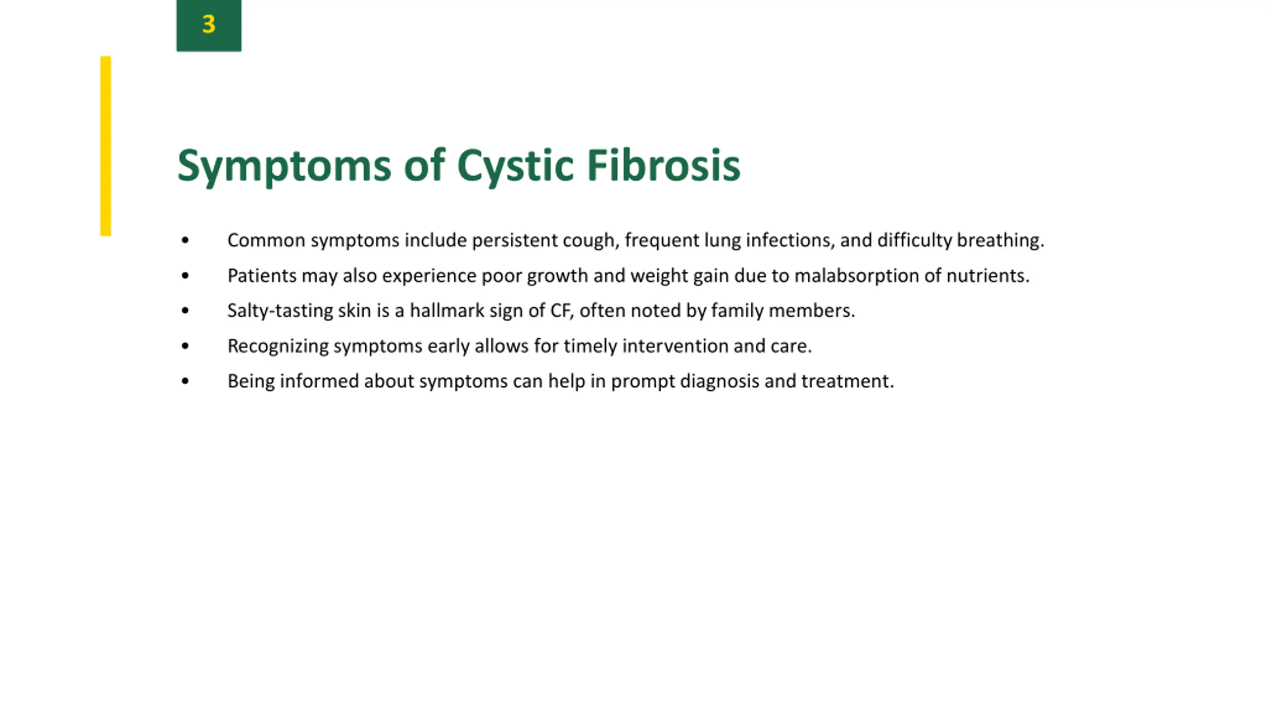 3 Symptoms of Cystic Fibrosis Common symptoms include persistent cough, frequentlung infections, and difficulty breathing. Patients may also experience poor growth and weight gain due to malabsorption of nutrients. Salty-tasting skin is a hallmark sign of CF, often noted by family members. Recognizing symptoms early allows for timely intervention and care. Being informed about symptoms can help in promptdiagnosis and treatment.