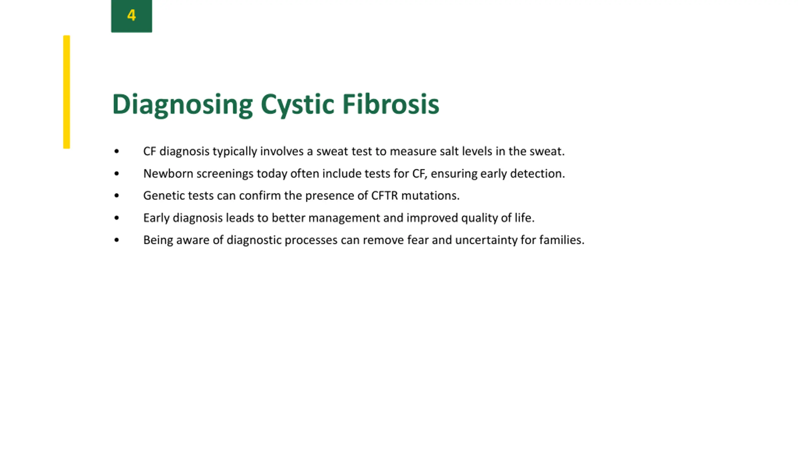 4 Diagnosing Cystic Fibrosis CF diagnosis typically involves a sweat test to measure salt levels in the sweat. Newborn screenings today often include tests for CF, ensuring early detection. Genetic tests can confirm the presence of CFTR mutations. Early diagnosis leads to better management and improved quality of life. Being aware of diagnostic processes can remove fear and uncertainty for families.