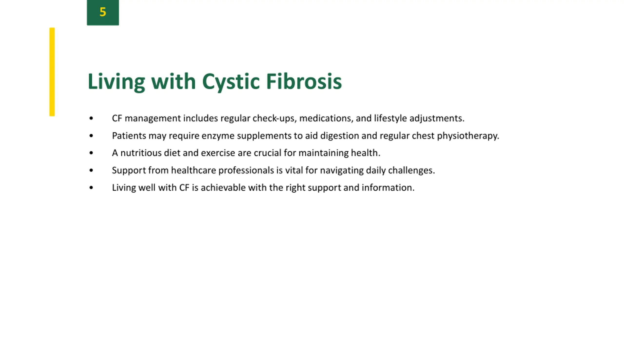 5 Living with Cystic Fibrosis CF management includes regular check-ups, medications, and lifestyle adjustments. Patients may requireenzyme supplements to aid digestion and regular chest physiotherapy. A nutritious diet and exercise are crucial for maintaininghealth. Supportfrom healthcare professionals is vital for navigating daily challenges. Living well with CF is achievable with the right support and information.