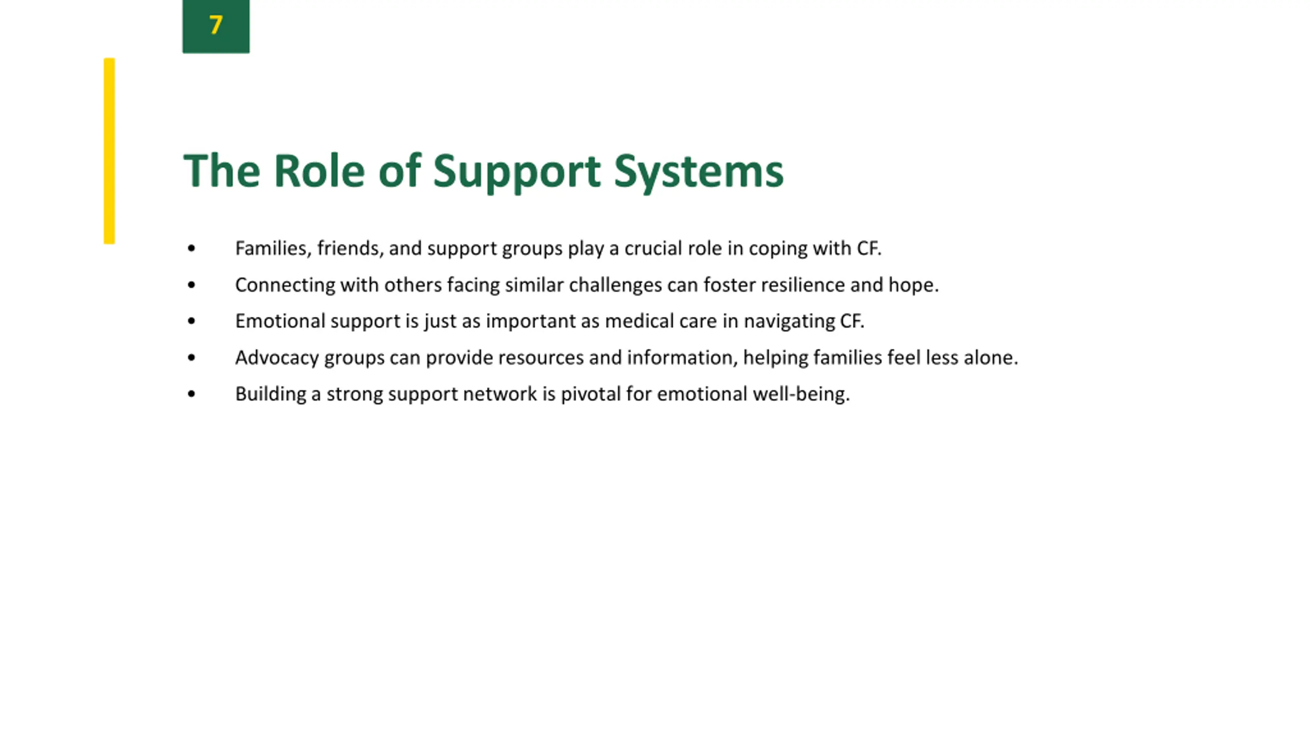 7 The Role of Support Systems Families, friends, and support groups play a crucial role in coping with CF. Connecting with others facing similar challenges can foster resilience and hope. Emotional support is just as importantas medical care in navigatingCF. Advocacy groups can provide resources and information, helping families feel less alone. Building a strong support network is pivotal for emotional well-being.