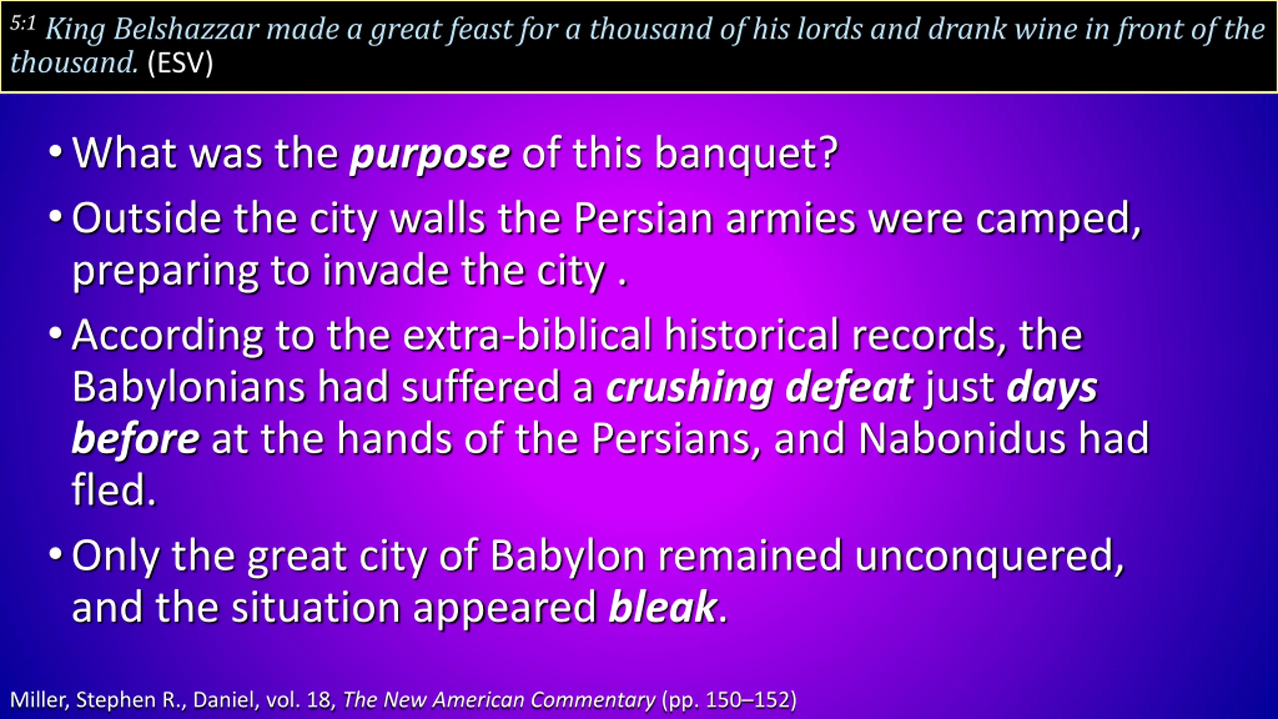 5:1 King Belshazzar made a great feast for a thousand of his lords and drank wine in front of the thousand. (ESV) What was the purpose of this banquet? Outside the city walls the Persian armies were camped, preparing to invade the city . According to the extra-biblical historical records, the Babylonians had suffered a crushing defeat just days before at the hands of the Persians, and Nabonidus had fled. Only the great city of Babylon remained unconquered, and the situation appeared bleak. Miller, Stephen R., Daniel, vol. 18, The New American Commentary (pp. 150 152)