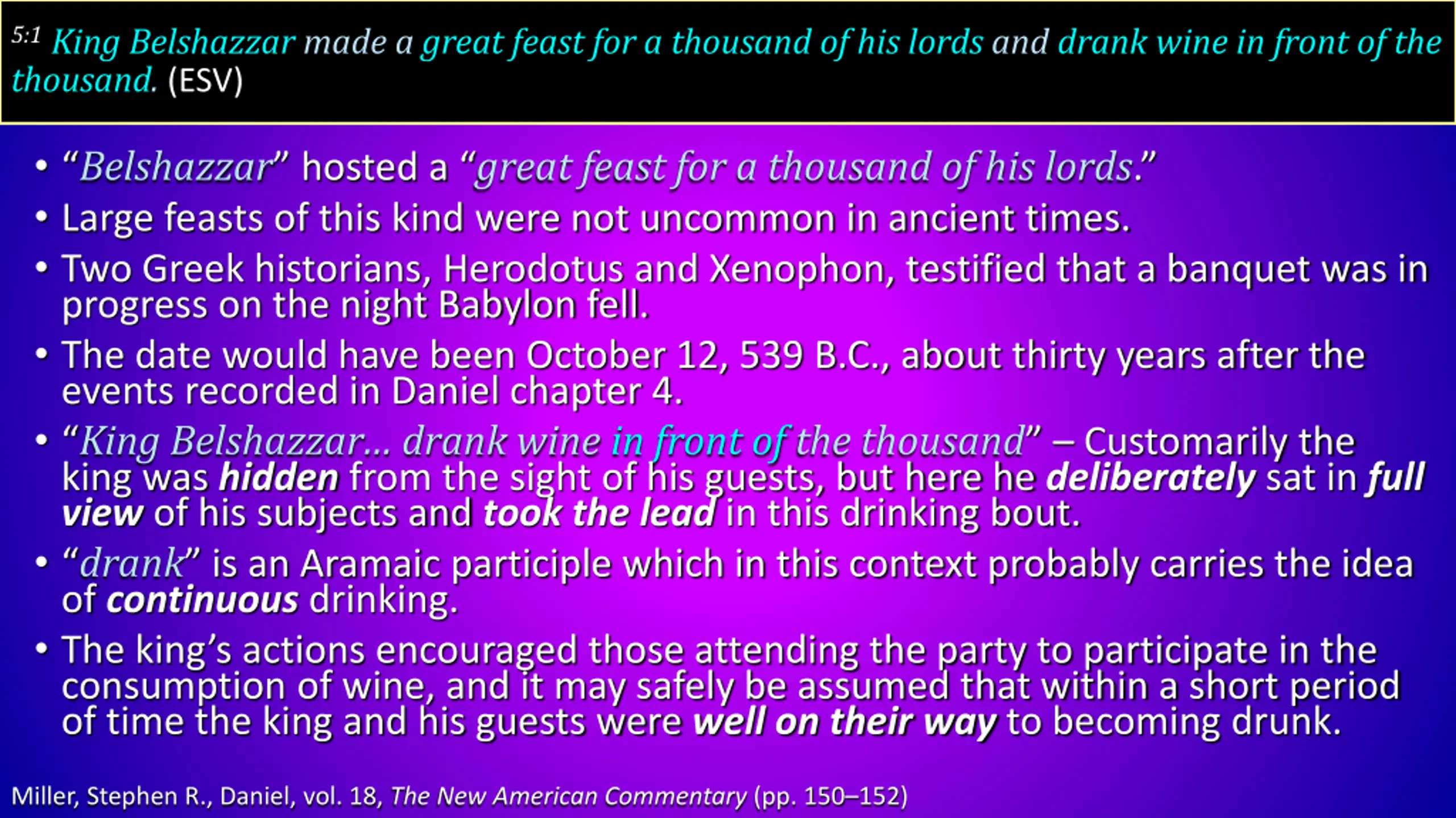 5:1 King Belshazzar made a great feast for a thousand of his lords and drank wine in front of the thousand. (ESV) Belshazzar hosted a great feast for a thousand of his lords. Large feasts of this kind were not uncommon in ancient times. Two Greek historians, Herodotus and Xenophon, testified that a banquet was in progress on the night Babylon fell. The date would have been October 12, 539 B.C., about thirty years after the events recorded in Daniel chapter 4. King Belshazzar drank wine in front of the thousand Customarily the king was hidden from the sight of his guests, but here he deliberately sat in full view of his subjects and took the lead in this drinking bout. drank is an Aramaic participle which in this context probably carries the idea of continuous drinking. The king s actions encouraged those attending the party to participate in the consumption of wine, and it may safely be assumed that within a short period of time the king and his guests were well on their way to becoming drunk. Miller, Stephen R., Daniel, vol. 18, The New American Commentary (pp. 150 152)