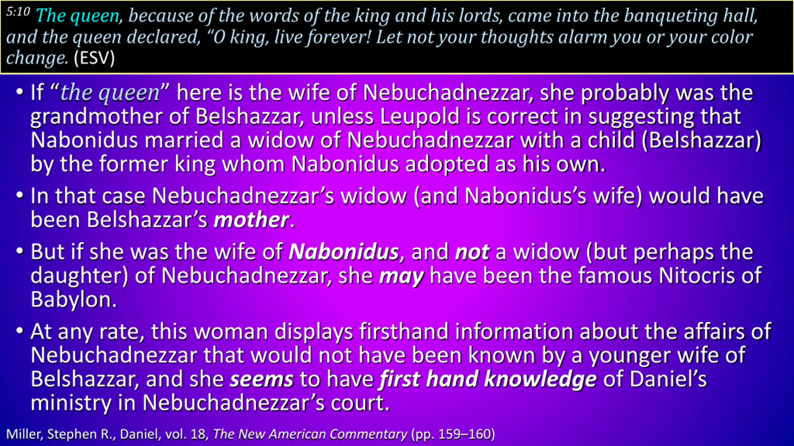 5:10 The queen, because of the words of the king and his lords, came into the banqueting hall, and the queen declared, O king, live forever! Let not your thoughts alarm you or your color change. (ESV) If the queen here is the wife of Nebuchadnezzar, she probably was the grandmother of Belshazzar, unless Leupold is correct in suggesting that Nabonidus married a widow of Nebuchadnezzar with a child (Belshazzar) by the former king whom Nabonidus adopted as his own. In that case Nebuchadnezzar s widow (and Nabonidus s wife) would have been Belshazzar s mother. But if she was the wife of Nabonidus, and not a widow (but perhaps the daughter) of Nebuchadnezzar, she may have been the famous Nitocris of Babylon. At any rate, this woman displays firsthand information about the affairs of Nebuchadnezzar that would not have been known by a younger wife of Belshazzar, and she seems to have first hand knowledge of Daniel s ministry in Nebuchadnezzar s court. Miller, Stephen R., Daniel, vol. 18, The New American Commentary (pp. 159 160)