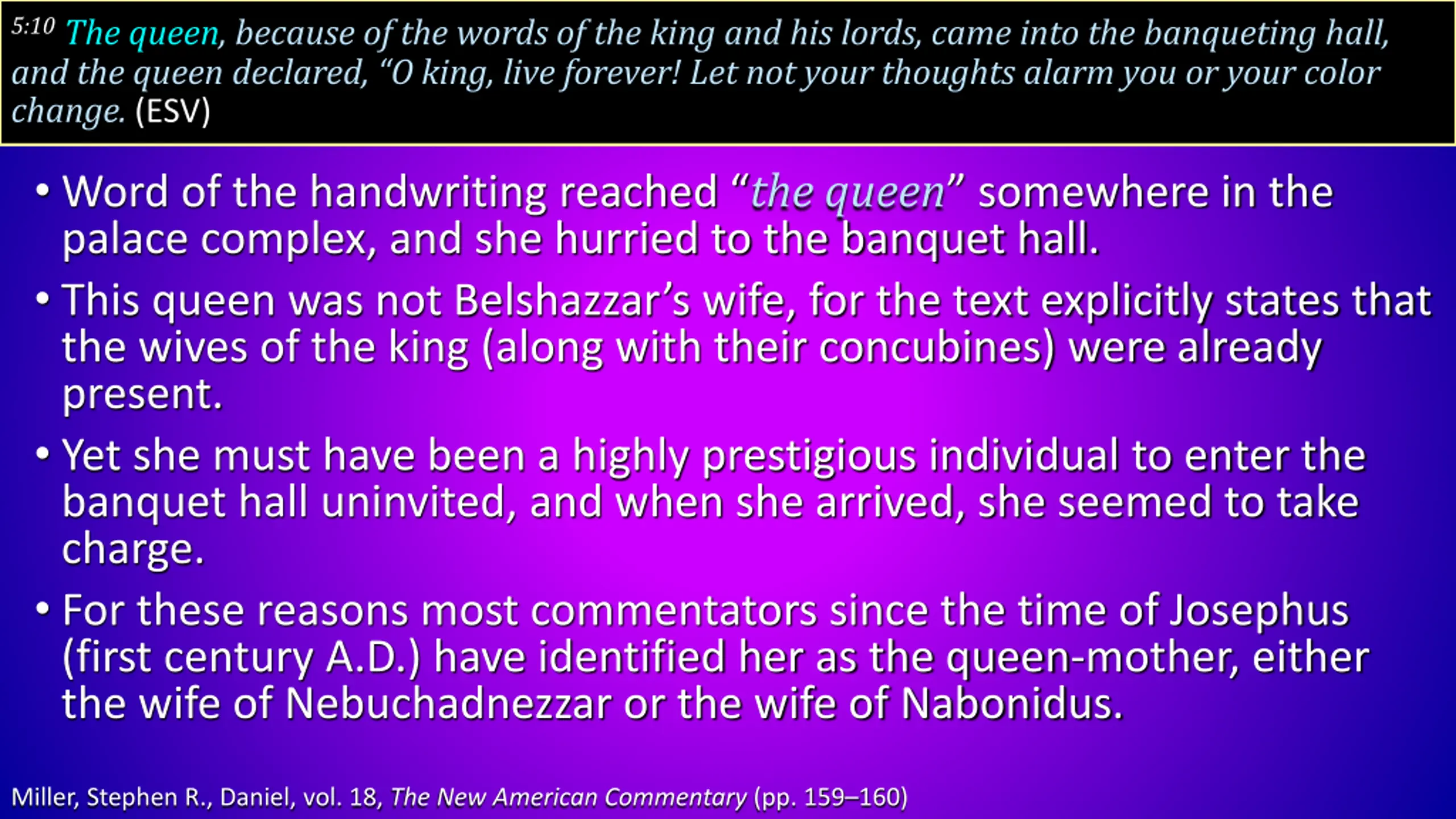 5:10 The queen, because of the words of the king and his lords, came into the banqueting hall, and the queen declared, O king, live forever! Let not your thoughts alarm you or your color change. (ESV) Word of the handwriting reached the queen somewhere in the palace complex, and she hurried to the banquet hall. This queen was not Belshazzar s wife, for the text explicitly states that the wives of the king (along with their concubines) were already present. Yet she must have been a highly prestigious individual to enter the banquet hall uninvited, and when she arrived, she seemed to take charge. For these reasons most commentators since the time of Josephus (first century A.D.) have identified her as the queen-mother, either the wife of Nebuchadnezzar or the wife of Nabonidus. Miller, Stephen R., Daniel, vol. 18, The New American Commentary (pp. 159 160)