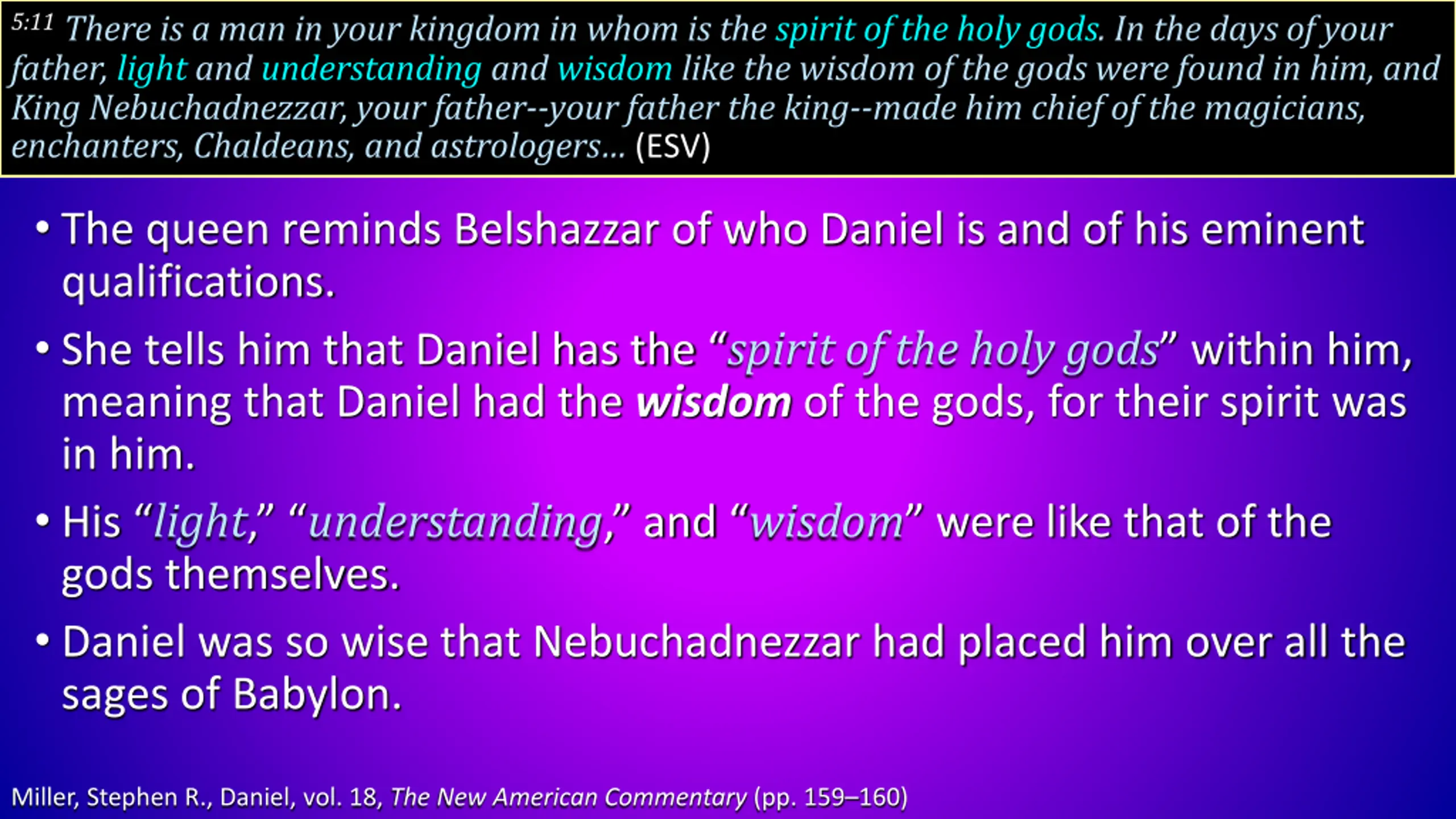 5:11 There is a man in your kingdom in whom is the spirit of the holy gods. In the days of your father, light and understanding and wisdom like the wisdom of the gods were found in him, and King Nebuchadnezzar, your father--your father the king--made him chief of the magicians, enchanters, Chaldeans, and astrologers (ESV) The queen reminds Belshazzar of who Daniel is and of his eminent qualifications. She tells him that Daniel has the spirit of the holy gods within him, meaning that Daniel had the wisdom of the gods, for their spirit was in him. His light, understanding, and wisdom were like that of the gods themselves. Daniel was so wise that Nebuchadnezzar had placed him over all the sages of Babylon. Miller, Stephen R., Daniel, vol. 18, The New American Commentary (pp. 159 160)